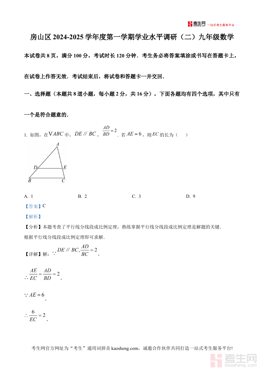 该资料适用于北京市房山区九年级学生、初中数学教师及区域教研人员。对学生而言,通过解析能深入理解试题考查方向与解题思路,助力知识巩固与能力提升;对教师和教研人员来说,可借助资料把握检测重点,为后续教学与备考指导提供科学依据,具有重要的阶段检测与备考规划价值。