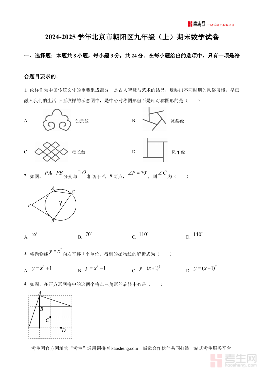 《精品解析:北京市朝阳区2024-2025学年九年级上学期期末考试数学试卷(原卷版)》是针对北京市朝阳区2024至2025学年九年级上学期数学期末考试推出的原卷版本备考资料。该资料精准对应朝阳区区域内九年级上学期期末数学考试的官方命题形式与考查框架,为使用者提供了与实际考试高度一致的测试内容载体,是九年级学生及相关教育工作者开展数学学科期末备考工作的重要参考资料之一。