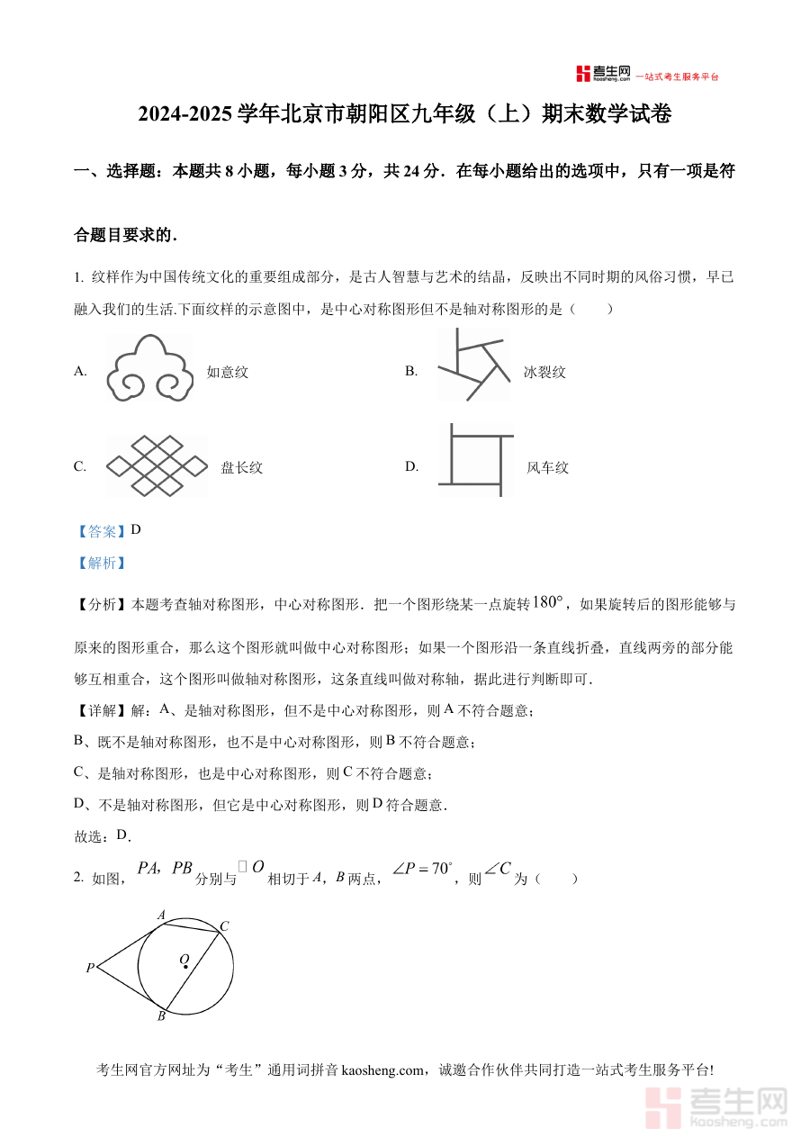 《精品解析:北京市朝阳区2024-2025学年九年级上学期期末考试数学试卷(解析版)》是针对北京市朝阳区2024至2025学年九年级上学期期末数学考试的专业备考资料,聚焦该地区该学年九年级学生的阶段学习成果检验需求,依托期末考试这一关键节点的考查目标,为使用者提供针对性的解析支持。