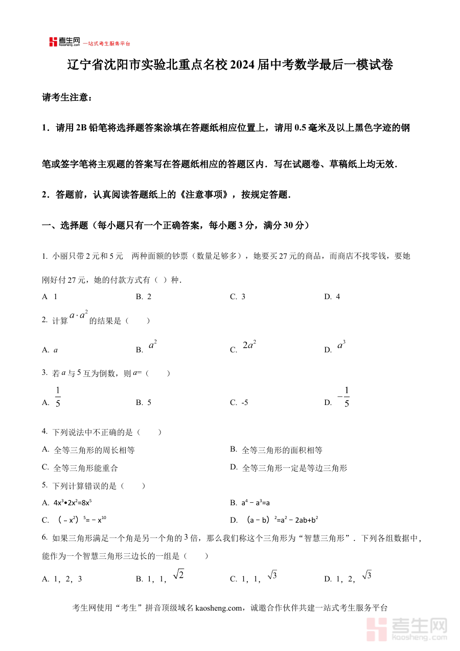 《精品解析:辽宁省沈阳市实验北重点名校2024年中考数学最后一模试卷 (原卷版)》是针对辽宁省沈阳市2024年初中毕业升学考试数学科目的备考资料,由当地重点名校实验北中学提供的最后一次模拟试卷原卷版本。该资料紧密贴合沈阳地区中考数学命题趋势与核心考查方向,为考生提供了与重点校同步的高质量模拟训练资源,助力考生提前熟悉中考数学的考查形式与难度层次。