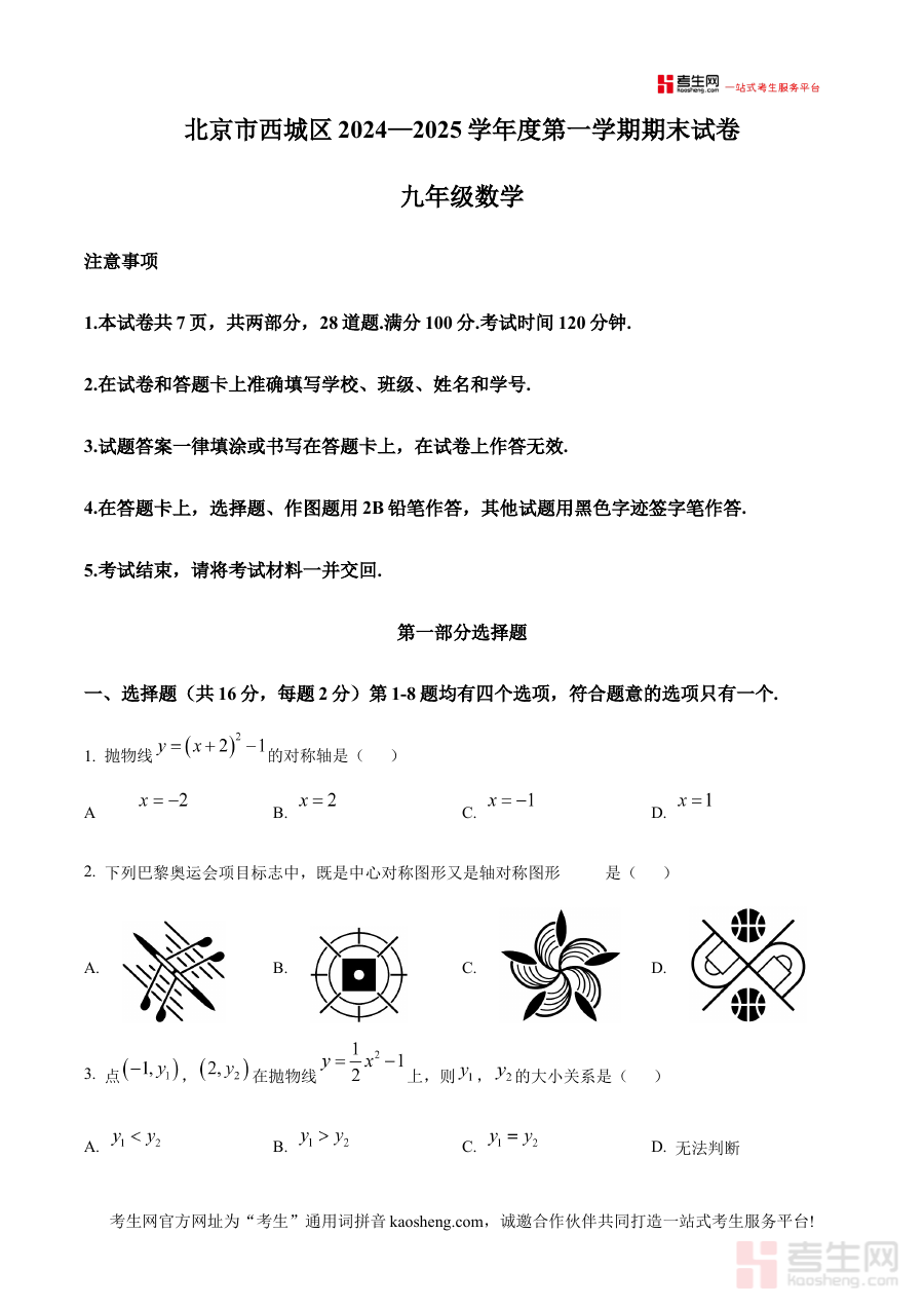 《精品解析:北京市西城区2024-2025学年九年级上学期期末考试数学试卷(原卷版)》是针对北京市西城区2024至2025学年九年级上学期期末数学考试的配套备考资料,聚焦该地区九年级学生阶段性学习成果的检测需求,为学生提供贴合本地教学进度与考试标准的原卷内容参考。