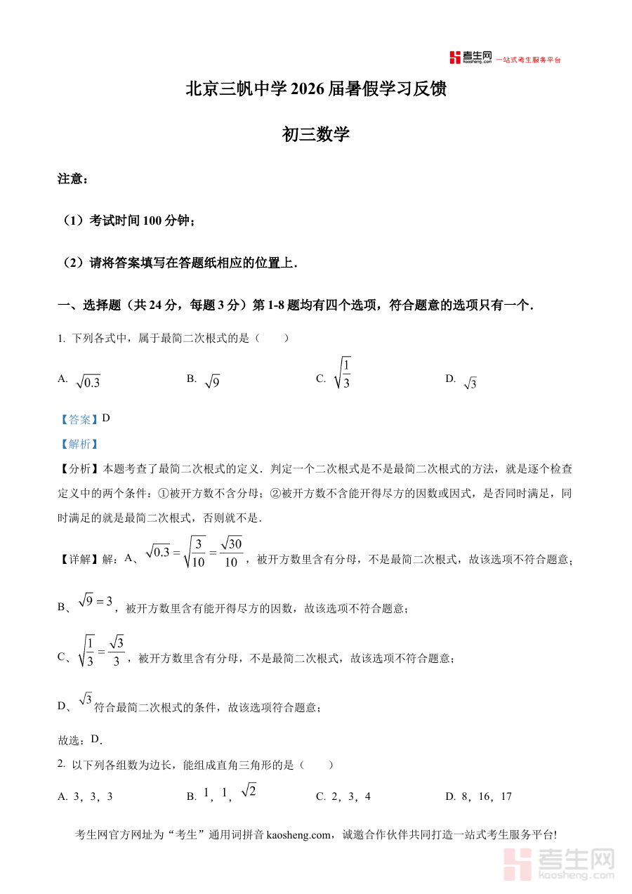 《精品解析:北京市三帆中学2025~2026学年上学期九年级开学考数学试卷(解析版)》是针对北京市三帆中学2025至2026学年上学期九年级开学阶段数学考试的专项备考资料。该资料紧密结合该校九年级开学考的时间节点与学科考查要求,依据学校教学进度与考试特点编制而成,为使用者提供与本校考试直接相关的复习方向和参考依据。