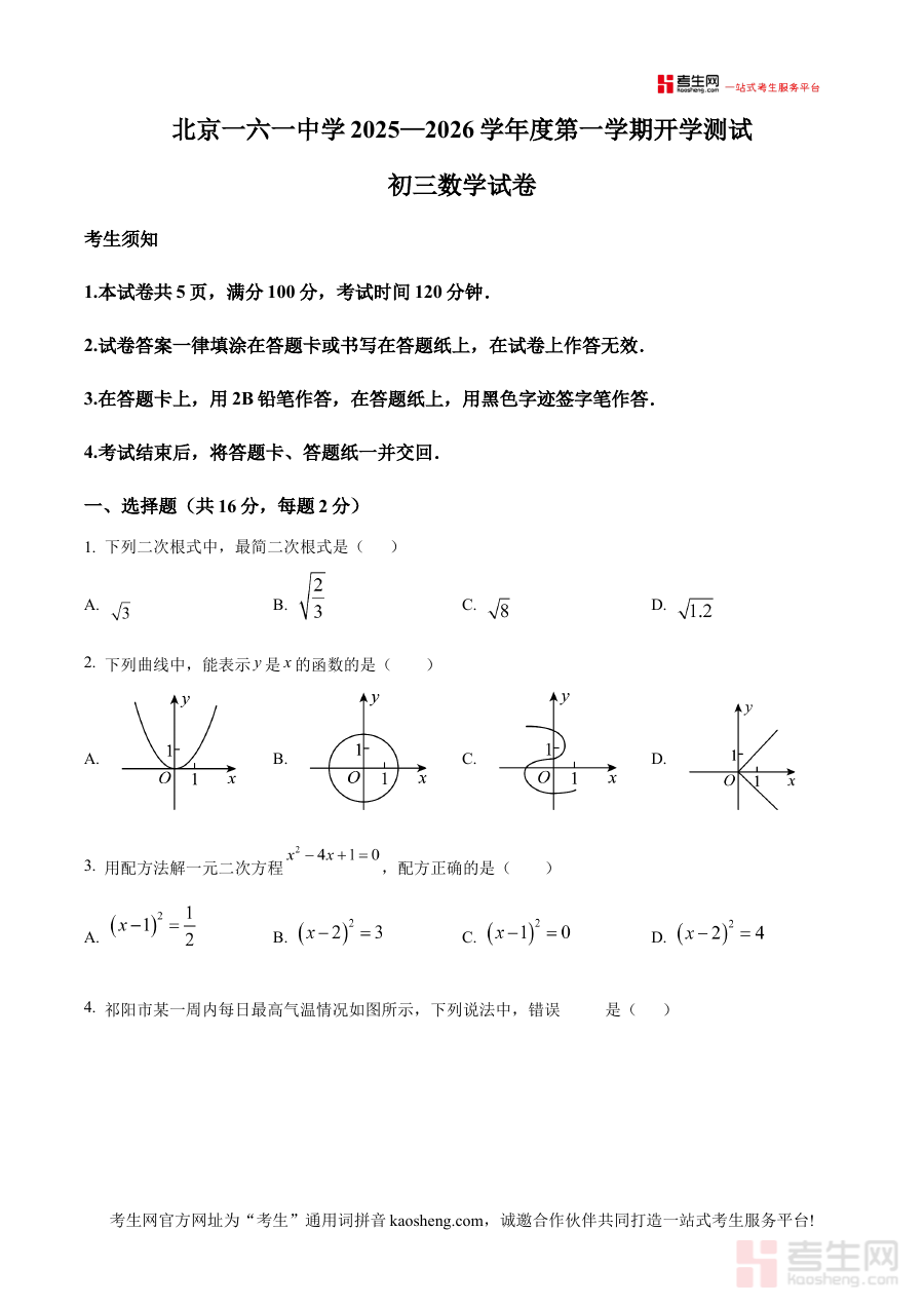 《精品解析:北京一六一中学2025-2026学年上学期开学测试九年级数学试卷 (原卷版)》是北京一六一中学针对2025-2026学年上学期九年级学生开展的开学测试数学试卷原卷资料。作为该校特定学年开学阶段的数学检测载体,它紧密贴合九年级上学期起始阶段的学习衔接需求,为后续教学活动的开展与学生备考规划提供基础参考依据,能够真实反映开学初期学生的数学知识掌握状况。