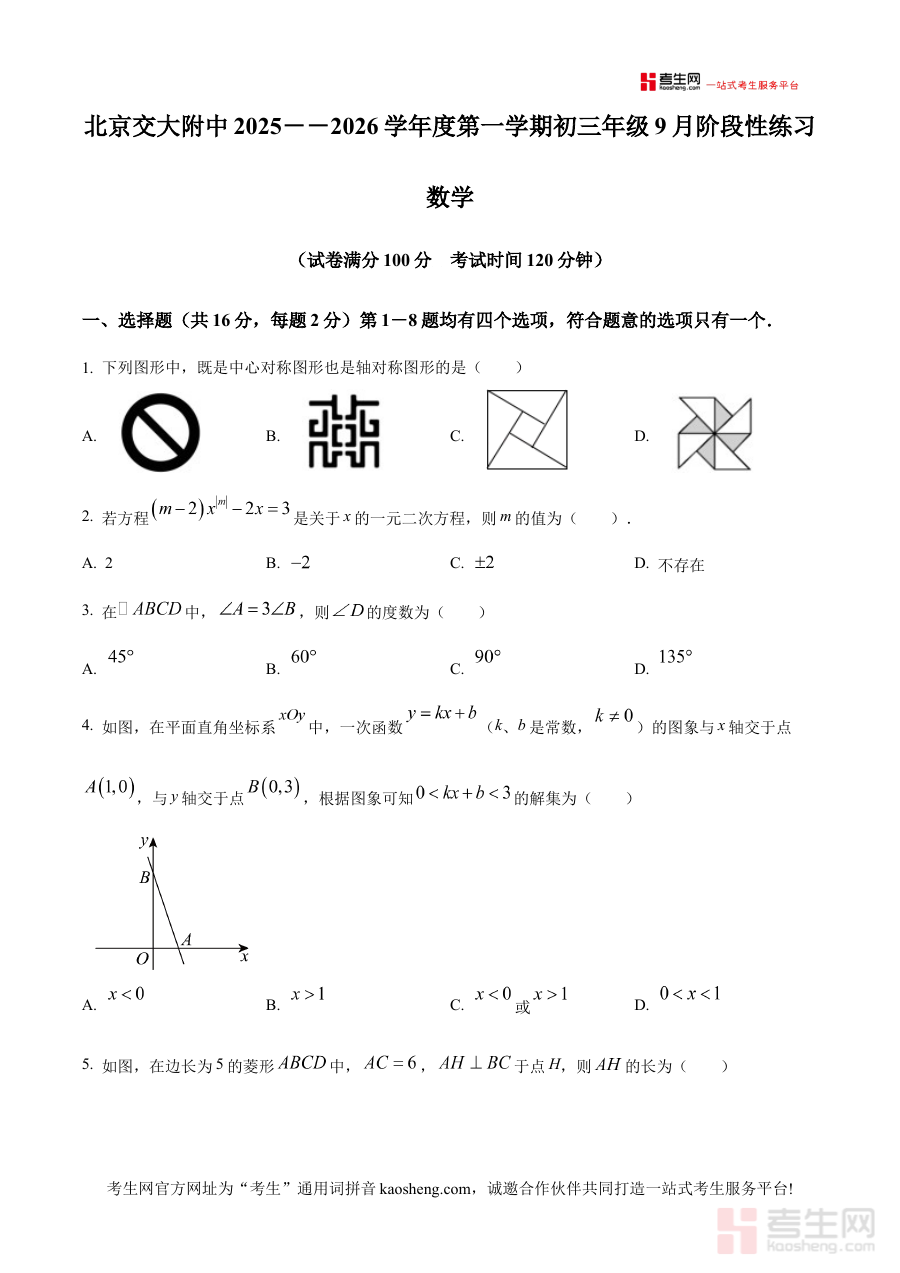 《精品解析:北京交通大学附属中学第二分校2025--2026学年上学期九年级数学开学考数学试卷(原卷版)》是针对北京交通大学附属中学第二分校2025至2026学年上学期九年级数学开学考试的备考资料,精准对应该学段该时间节点的考试需求,为相关师生提供贴合实际考试场景的资料载体。