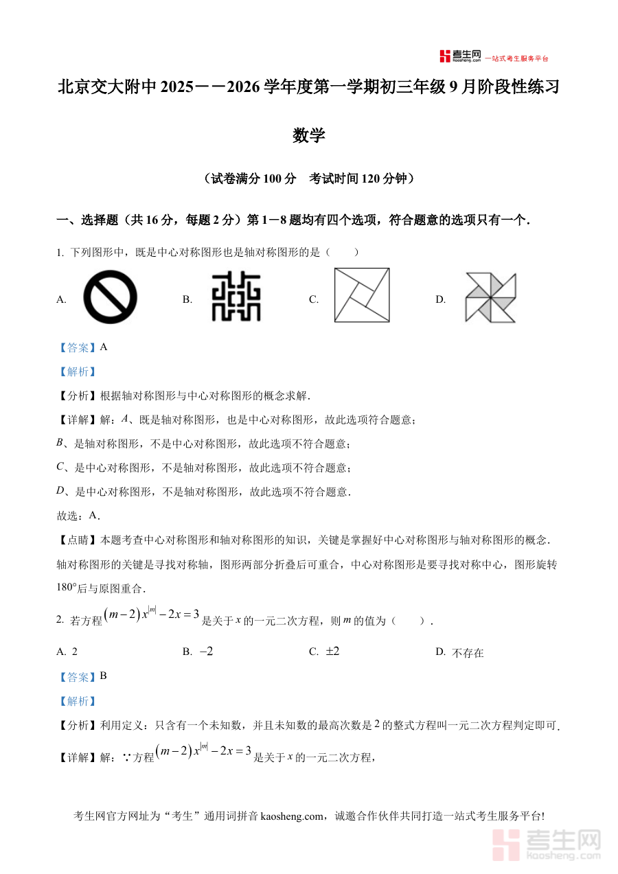 本资料主要适用于北京交通大学附属中学第二分校2025级九年级学生,亦可为同类学校或相似阶段学生提供开学考备考参考,其解析内容能深化对考试内容的理解,增强阶段检测的有效性,为新学期数学学习的有序推进筑牢基础。