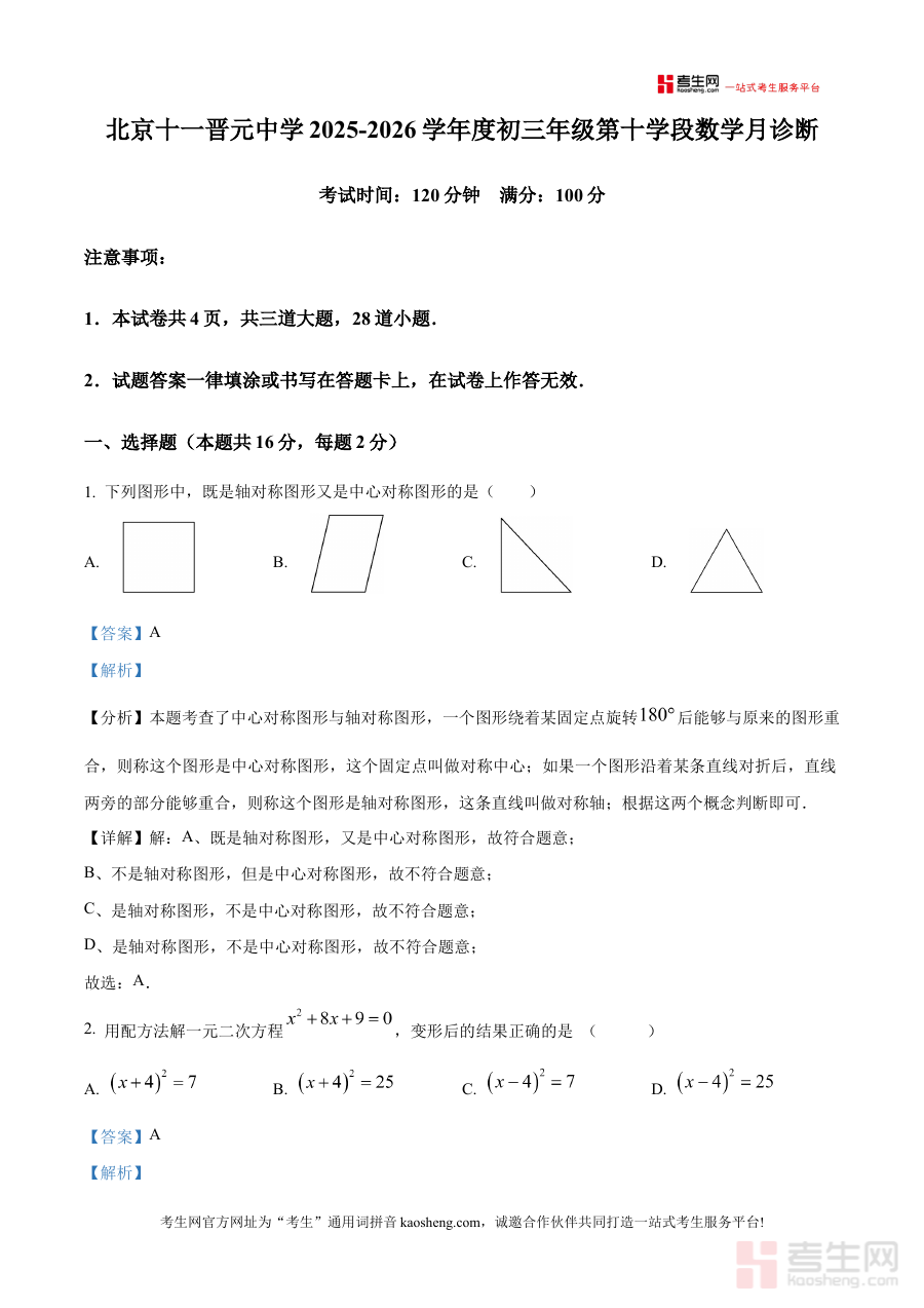 《精品解析:北京十一晋元中学2025-2026学年上学期九年级第十学段数学月诊断试题(解析版)》是针对北京十一晋元中学2025-2026学年上学期九年级第十学段数学月诊断考试的配套备考资料,聚焦该阶段数学学科阶段性学习成果检测的核心需求,为相关使用者提供与本次考试直接关联的解析内容支持。