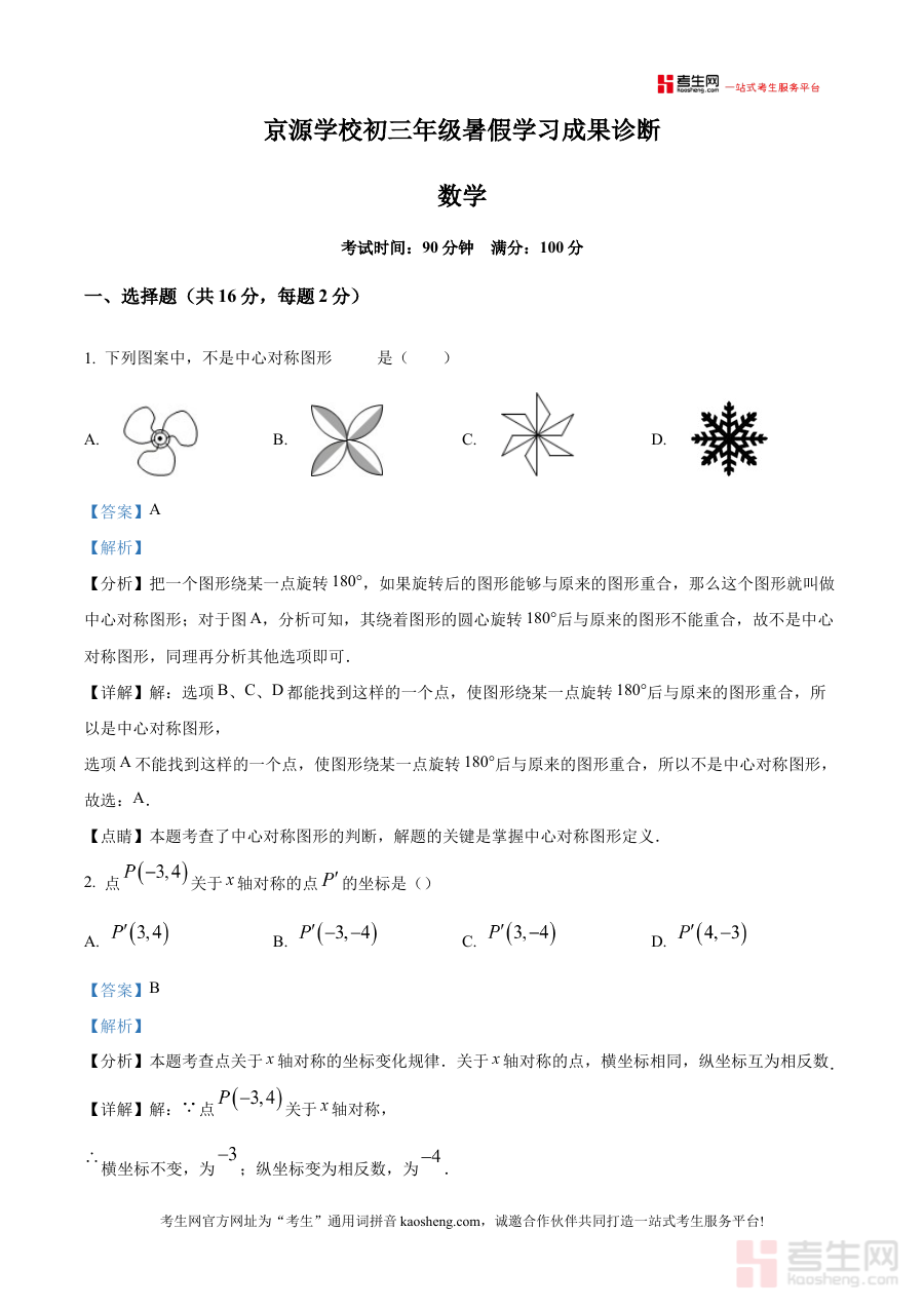 《精品解析:北京市京源学校2025-2026学年上学期开学考考试九年级数学试题(解析版)》是针对北京市京源学校特定学年段开展的九年级数学开学检测的专业备考资料,聚焦该学校在新学年初始阶段对学生数学知识掌握情况的考查需求,为相关使用者提供与本次考试直接关联的解析类内容支持。