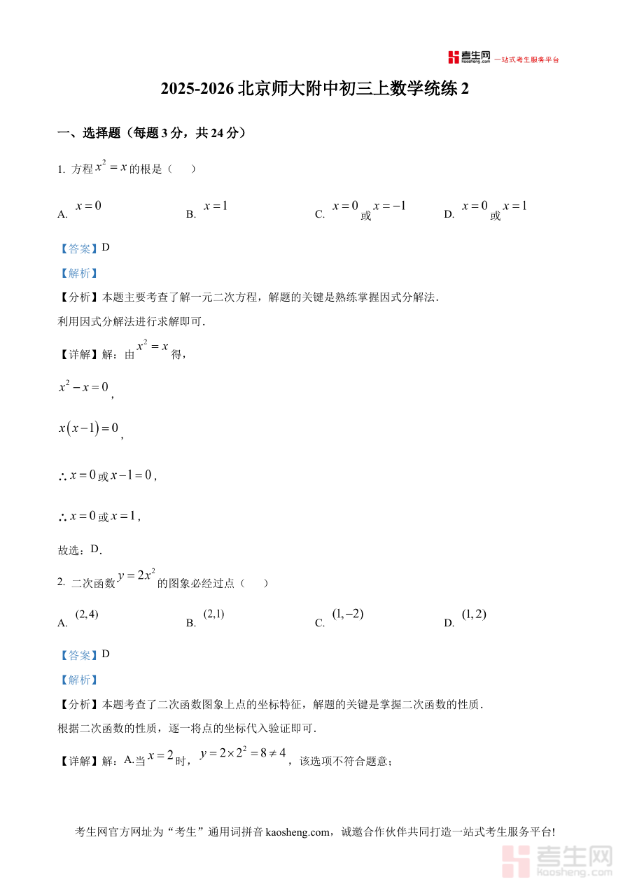本资料主要适用于北京市西城区北京师范大学附属中学2025-2026学年九年级上学期的学生,也可为该学段数学教师提供教学参考或家长了解孩子学习状况的工具。其核心价值在于通过阶段检测的解析内容帮助学生巩固所学知识、提升应试能力,助力他们在后续学习中更高效地规划备考方向,为阶段性学习成果的巩固与提升奠定坚实基础。