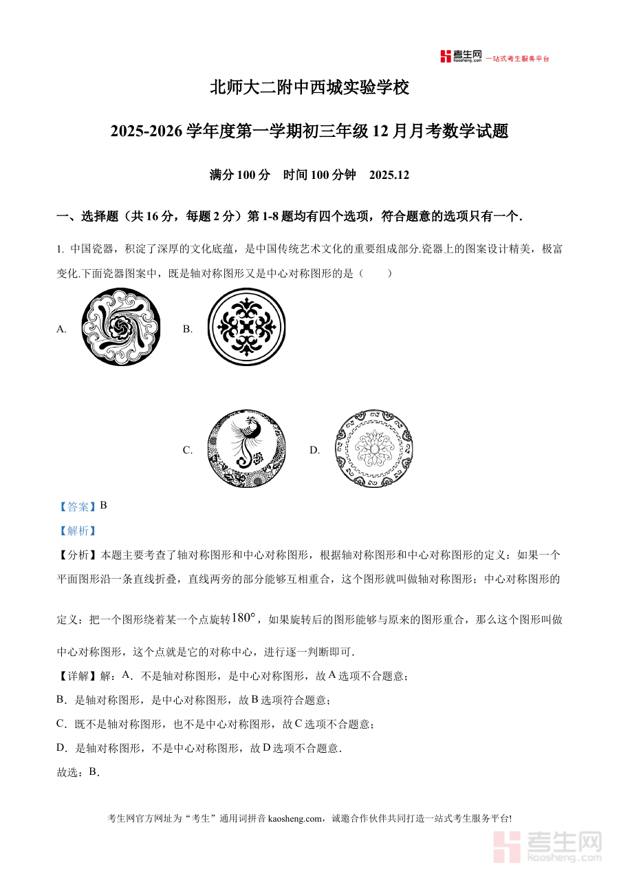 《精品解析:北京市北京师范大学第二附属中学西城实验学校数学2025-2026学年上学期九年级数学12月月考 试题(解析版)》是针对北京市北京师范大学第二附属中学西城实验学校2025-2026学年上学期九年级数学12月月度检测的专业备考资料,紧密贴合该校该阶段数学学科的考试要求与教学进度,为学生提供精准的学习参考。