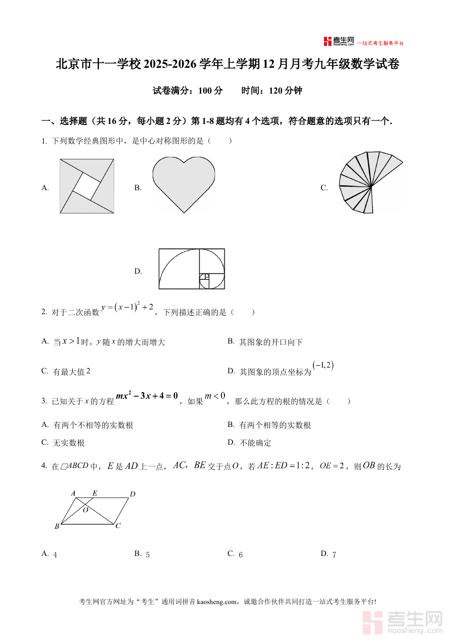 《精品解析:北京市十一学校2025-2026学年上学期12月月考九年级数学试卷(原卷版)》是针对北京市十一学校2025-2026学年上学期九年级数学学科12月月考设计的配套备考资料,紧密贴合该校该阶段内部阶段性检测要求,为学生提供与校考实际高度匹配的练习资源。