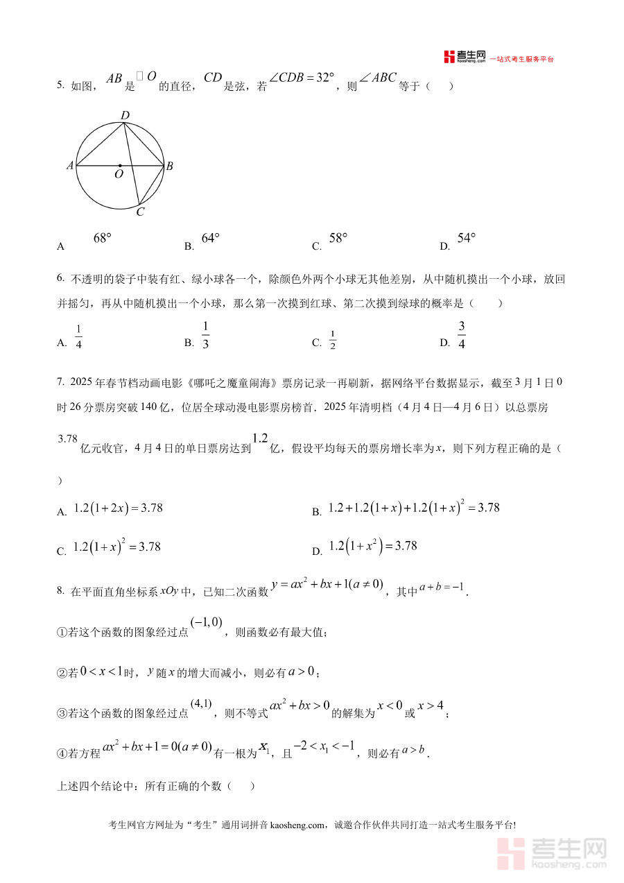 该资料可用于九年级学生进行数学学科的阶段学情诊断,帮助学生精准把握自身知识掌握程度与能力薄弱环节,同时为教师和家长提供直观的学习情况反馈,助力制定个性化的后续备考规划与学习调整策略。