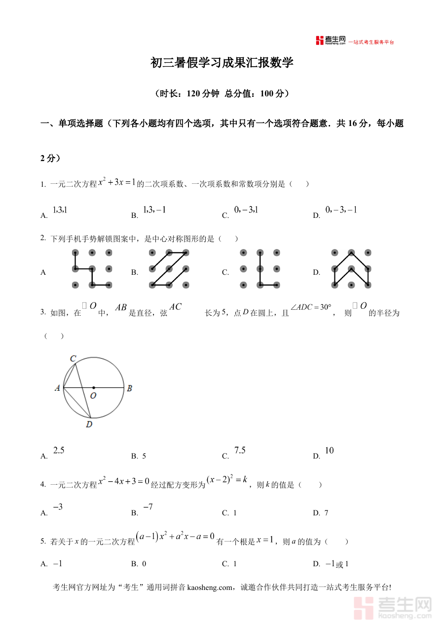 该资料可用于九年级学生在开学初期进行自我学情诊断,帮助教师了解学生暑期及前期知识掌握情况,为后续教学与备考规划提供数据支持,同时也能让学生明确开学阶段的数学学习重点与自身薄弱环节。
