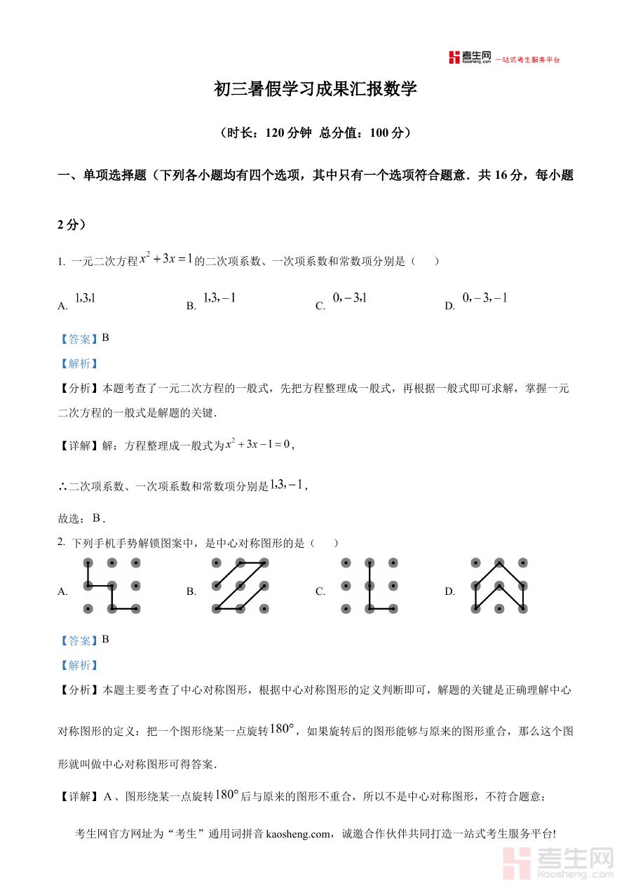 该资料可用于学生在开学考试前进行自我学情诊断,帮助教师了解学生假期后数学知识的掌握情况,也能为后续九年级上学期数学教学及备考规划提供数据参考和方向指引,助力师生明确阶段学习重点与提升空间。