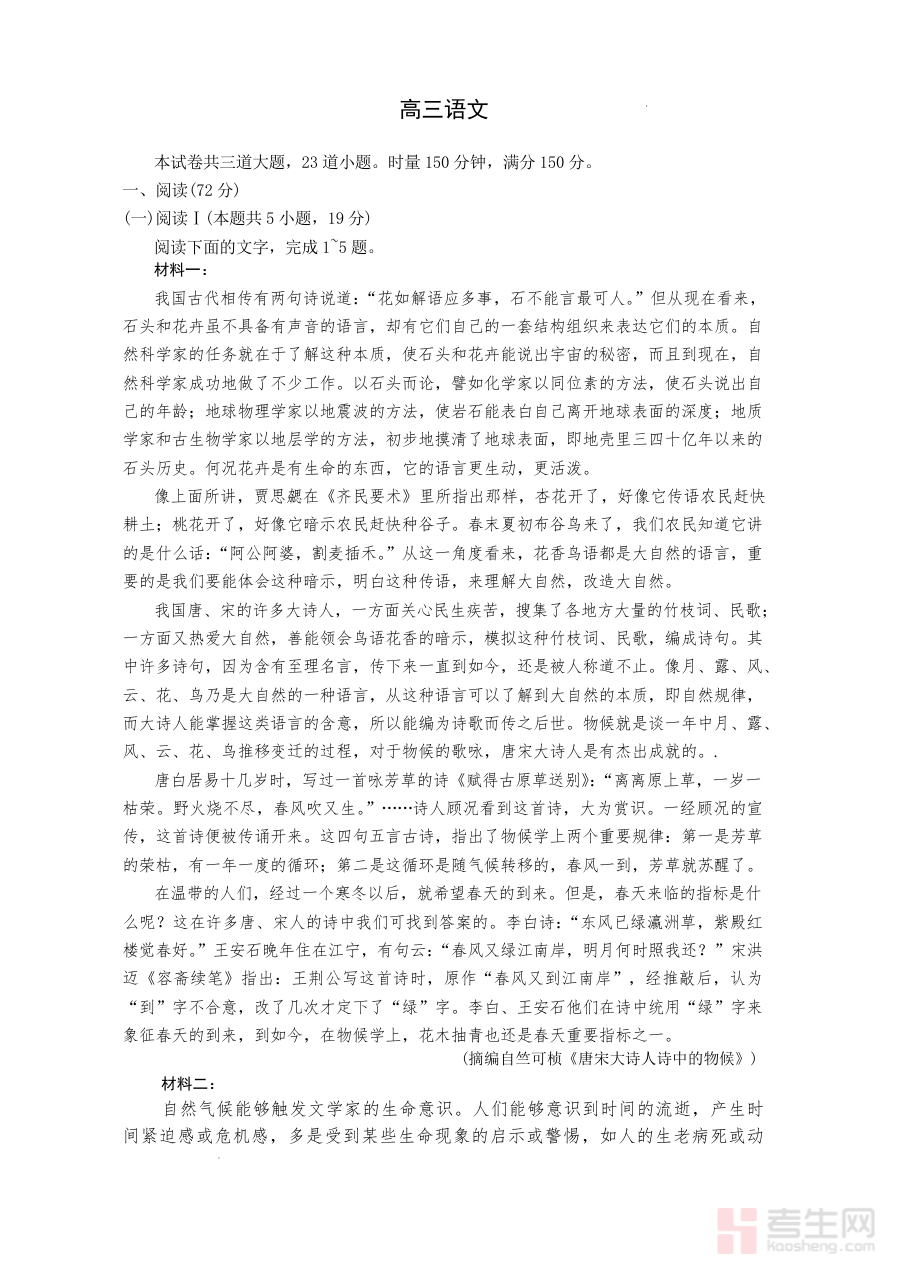 此试卷可用于高三语文学习过程中的学情诊断与阶段检测,能够帮助教师准确掌握学生的知识掌握情况与能力薄弱环节,为后续教学内容调整和备考规划制定提供数据支撑;同时也能让学生通过实际测试,熟悉高三语文考试的命题思路与答题节奏,增强应试状态下的适应能力与解题技巧,为后续的系统复习和冲刺阶段做好准备。