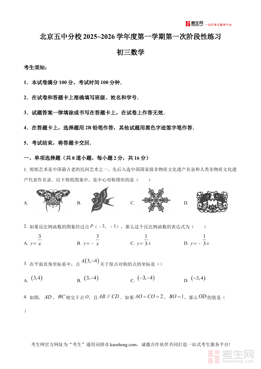 《精品解析:北京市第五中学分校2025-2026学年上学期九年级开学考数学试题(原卷版)》是针对2025至2026学年上学期北京市第五中学分校九年级开学数学考试打造的专用备考资料,明确覆盖了特定学年、学校、年级及考试类型的核心信息,为相关师生提供了贴合该阶段考试需求的原始试卷资源,助力使用者快速对接本次开学考的考查背景与基本框架。