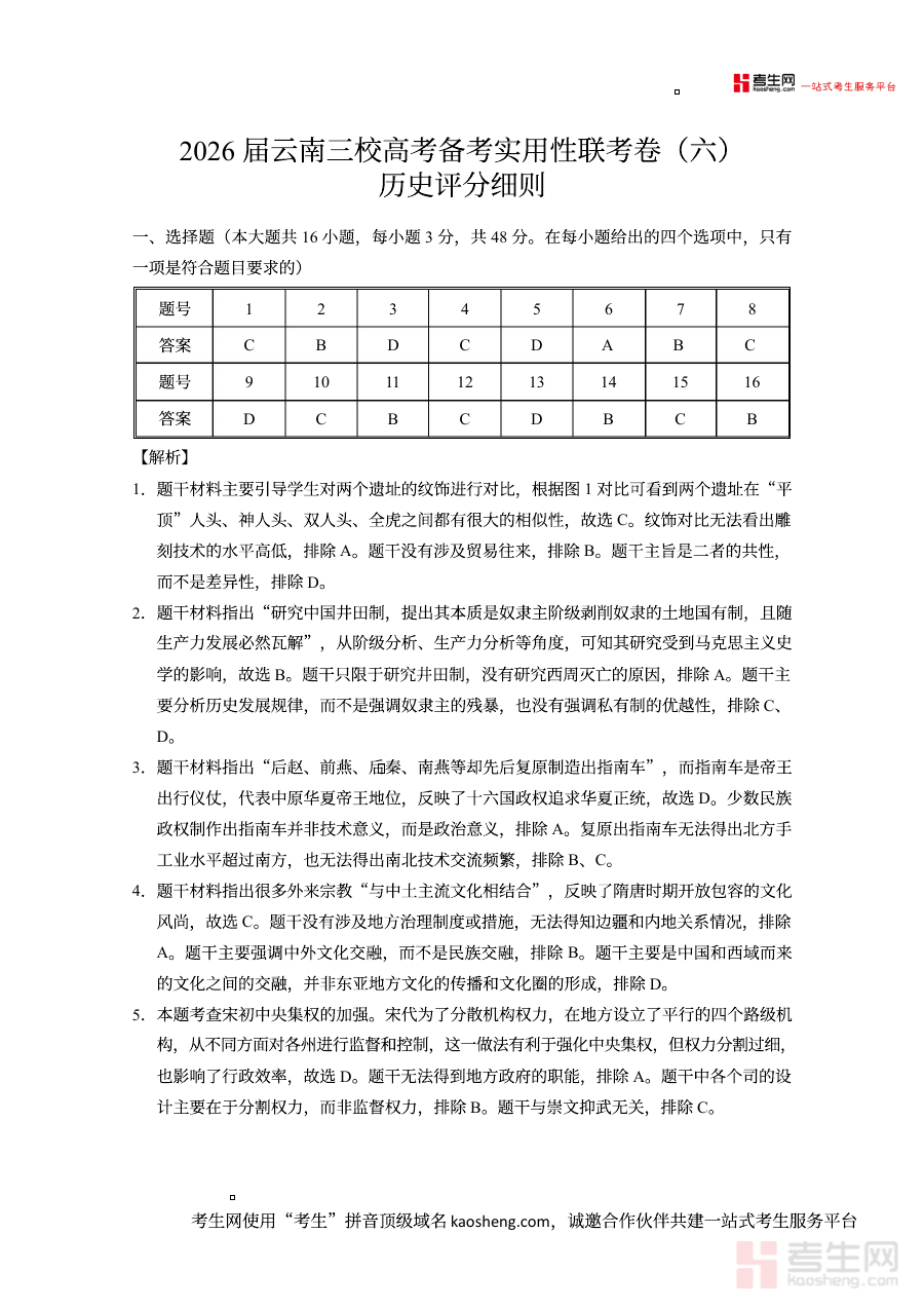 《2026届云南三校高考备考实用性联考卷(六)历史-答案》是针对2026届云南省三所学校联合组织的高考历史备考系列实用性联考第六次考试的配套答案资料。该资料与同期的联考历史试卷紧密对应,旨在为考生和教学人员提供精准的作答参考,助力备考阶段的针对性复习。它依托云南三校联考的命题方向和备考需求,是高考历史备考过程中不可或缺的辅助资源之一,能够帮助相关群体及时获取联考作答的标准依据。