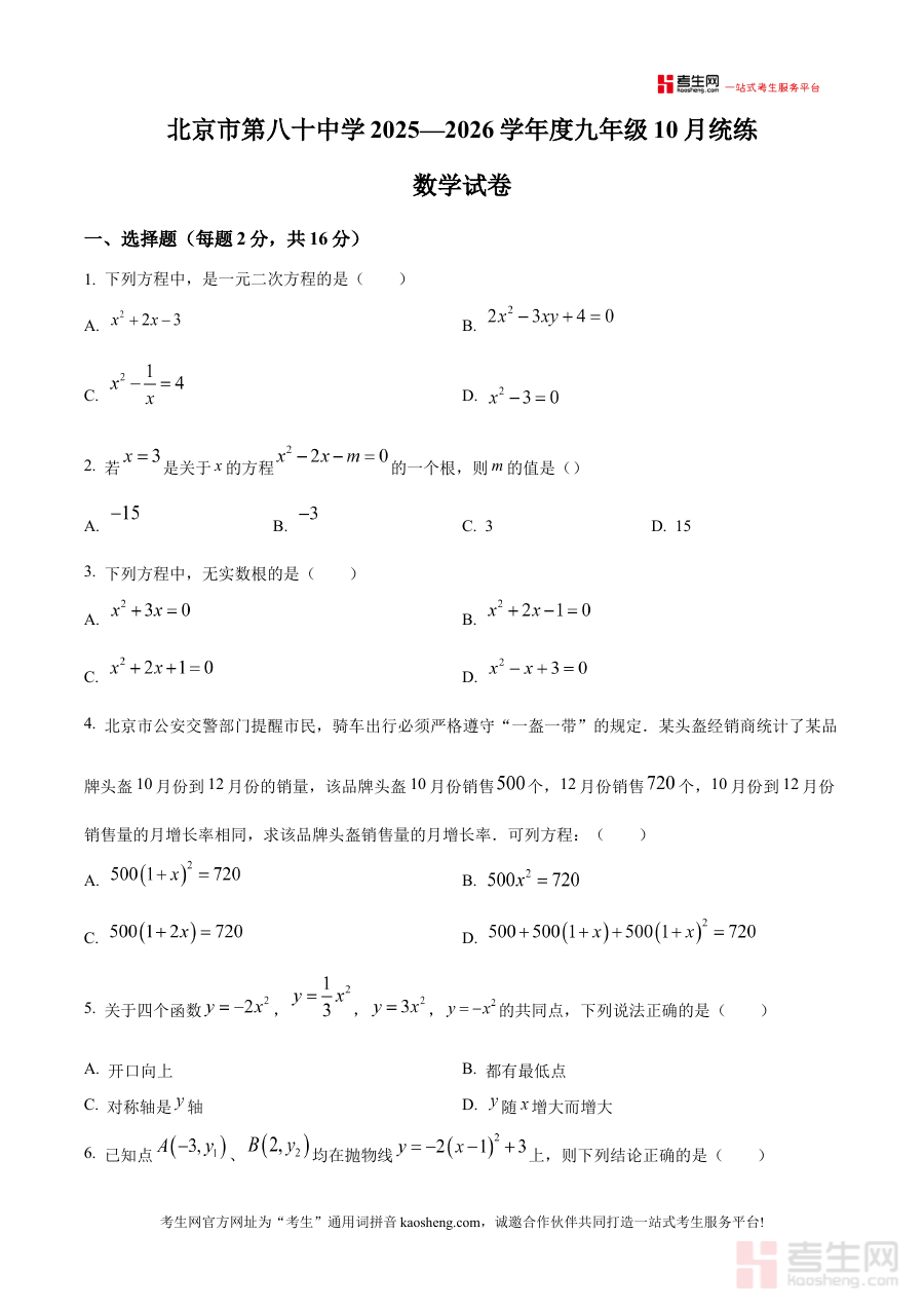 《精品解析:北京市第八十中学2025--2026学年上学期10月月考九年级数学试卷(原卷版)》是北京市第八十中学在2025—2026学年上学期针对九年级数学学科组织的10月月考所使用的官方原卷资料,属于该阶段数学学科考试的备考参考材料,能够为学习者提供与实际考试一致的试卷形式与考查情境。
