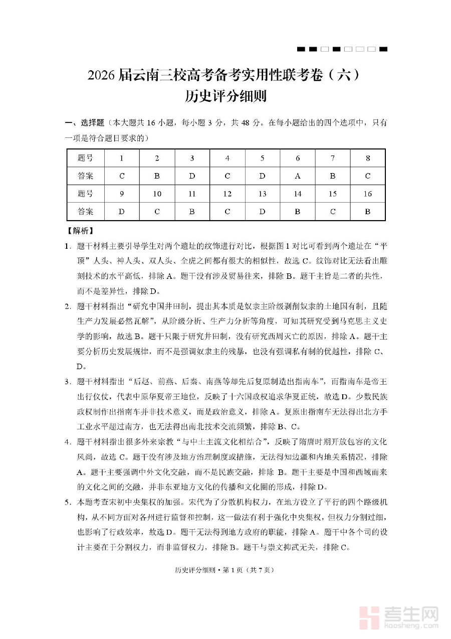 《2026届云南三校高考备考实用性联考卷(六)历史-答案》是面向2026届云南省三所学校联合开展的高考历史备考系列联考第六套试卷配套的官方答案。该资料属于高考历史备考阶段的核心辅助资源范畴,与对应联考卷形成完整的“检测-反馈”体系,为考生和教师提供权威且标准化的作答参考依据。