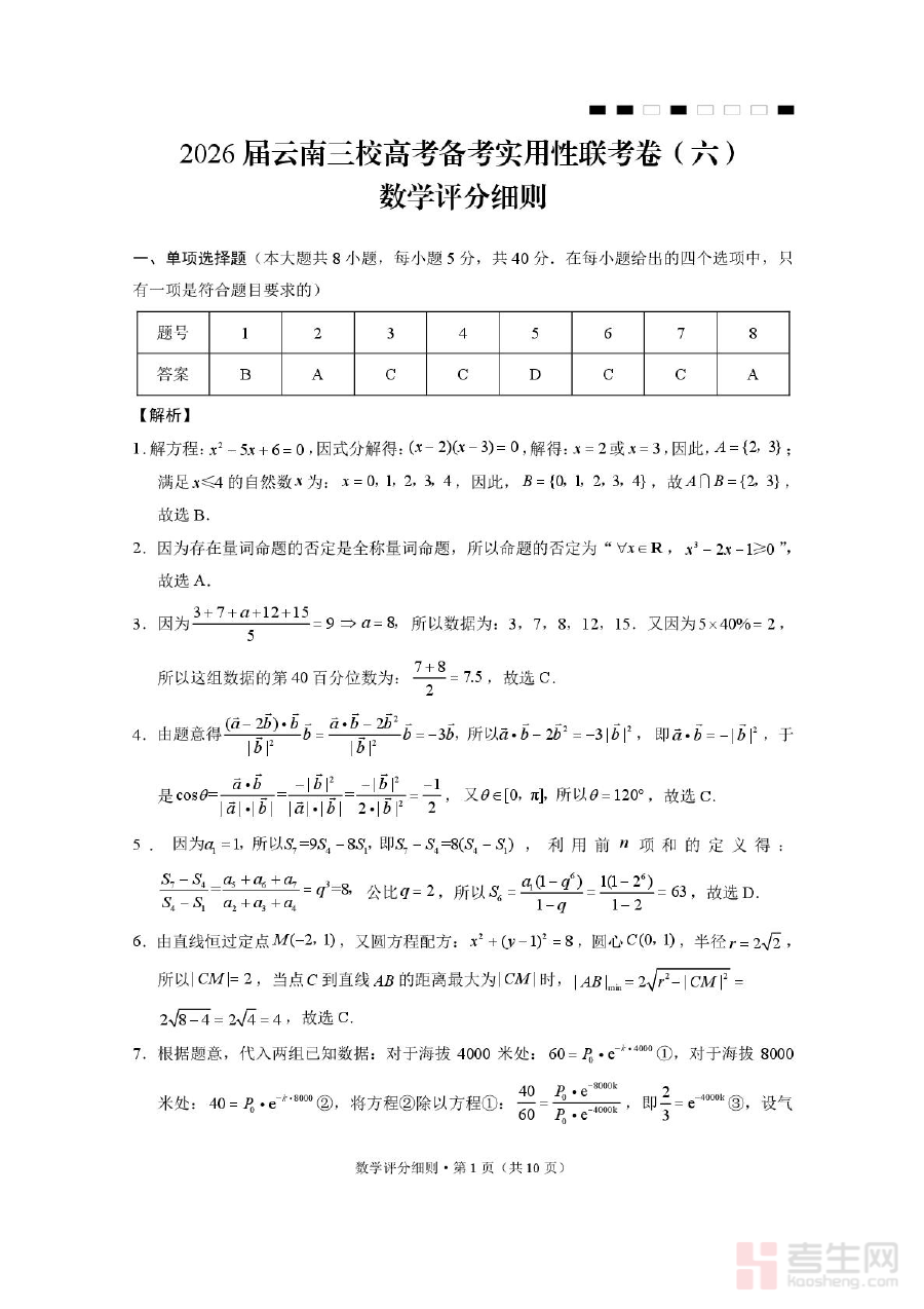 《2026届云南三校高考备考实用性联考卷(六)数学-答案》是针对2026届云南地区三校联合组织的高考备考实用性联考第六次考试的数学科目答案资料,属于高考备考阶段的配套参考资源,旨在为考生和教学人员提供该次联考数学科目的标准解答依据。