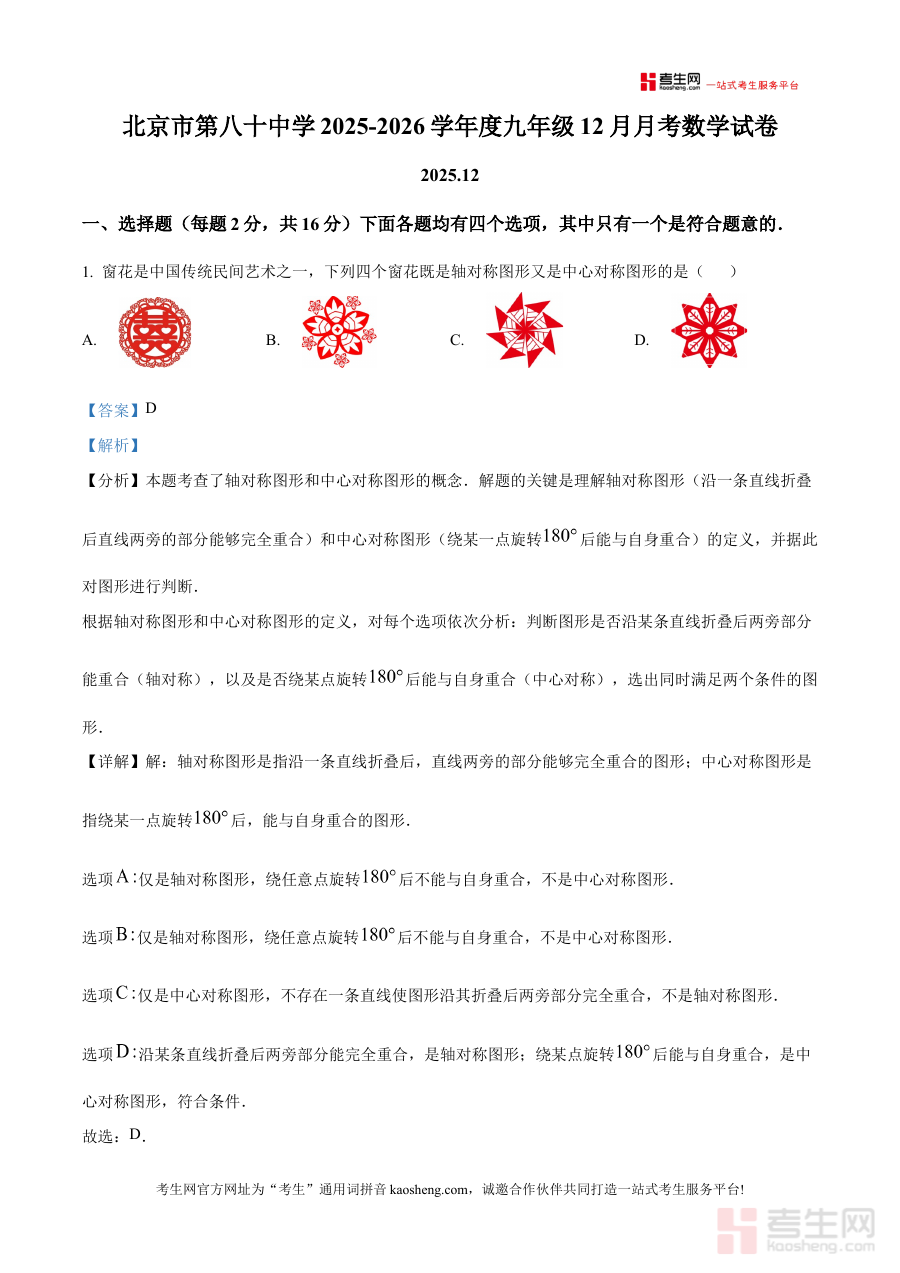 《精品解析:北京市第八十中学2025-2026学年上学期12月份月考九年级数学试题(解析版)》是针对北京市第八十中学2025-2026学年上学期九年级数学学科12月份月考的专项解析资料,贴合该学校内部阶段性考试的考查特点,为学生提供对应考试的精准备考辅助。