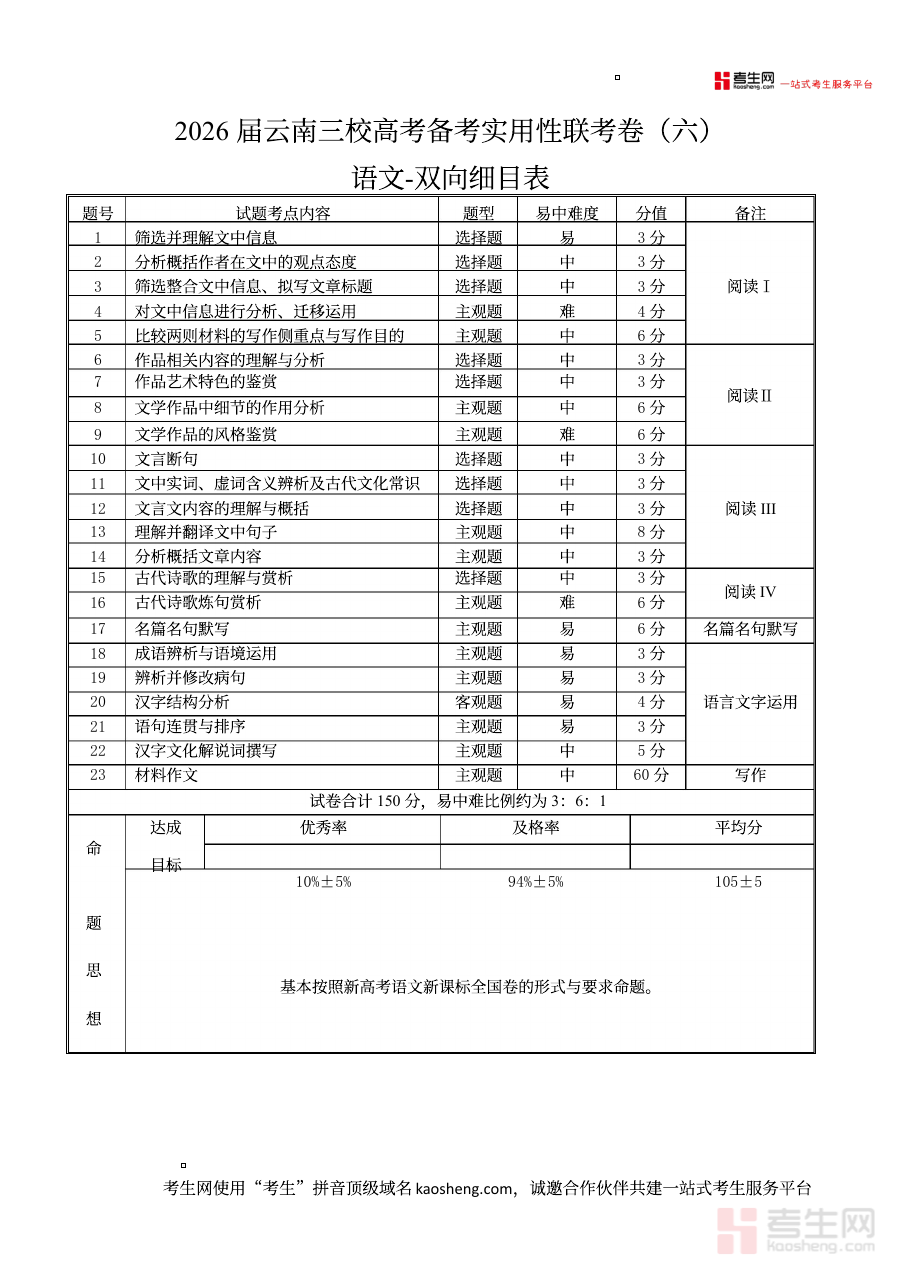 《2026届云南三校高考备考实用性联考卷(六)语文-双向细目表》是针对2026届云南省三所学校联合开展的高考语文备考设计的实用性联考卷第六套对应的双向细目表,属于高考语文备考阶段的重要辅助资料。该资料依托云南三校联考体系,聚焦高考语文备考核心需求,为师生提供结构化的内容参考依据,助力把握联考的考查方向与整体框架。
