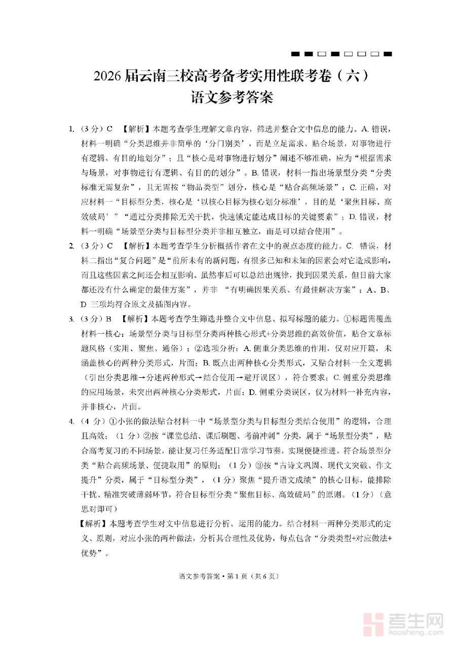 《2026届云南三校高考备考实用性联考卷(六)语文-答案》是针对2026届云南地区三校合作高考备考体系推出的第六次实用性联考语文科目的配套参考答案。作为高考备考阶段的重要辅助资料,它与对应的联考卷形成完整的检测与反馈闭环,为考生和教学者提供标准化的参考依据。