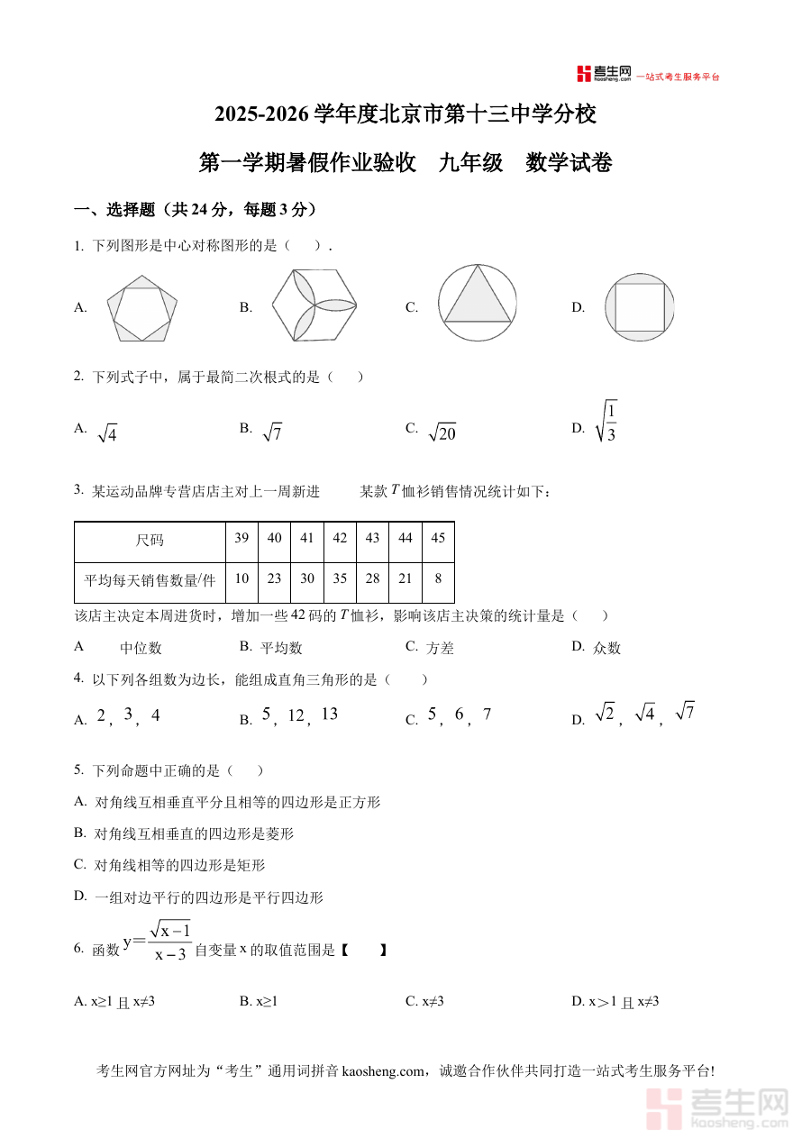 《精品解析:北京市第十三中学2025-2026学年九年级上学期开学考试数学试题(原卷版)》是针对北京市第十三中学2025-2026学年九年级上学期开学数学考试的备考资料,聚焦该学年九年级学生开学阶段的数学学业水平检测需求,为相关群体提供贴合校考实际的参考内容。