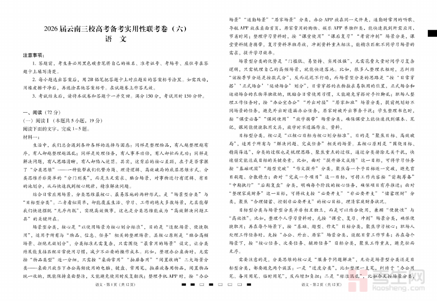 《2026届云南三校高考备考实用性联考卷(六)语文-试卷》是针对2026届云南地区三所学校高三学生设计的高考语文备考专项资料,属于阶段性联考类备考资源。该试卷由三校联合命题,聚焦高考语文备考的核心方向,结合本地教学实际与高考命题趋势,为学生提供具有实用性的练习载体,旨在通过联考形式帮助学生适应高考备考的阶段性要求,衔接后续冲刺阶段的学习目标。