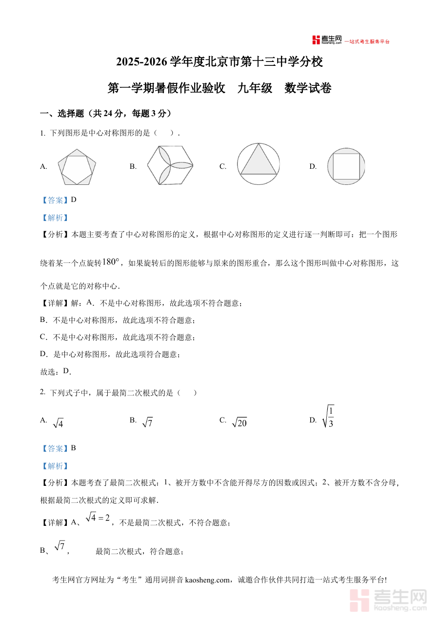 《精品解析:北京市第十三中学2025-2026学年九年级上学期开学考试数学试题(解析版)》是针对北京市第十三中学特定学年九年级上学期开学数学考试的备考资料。该资料依托学校开学考试的实际需求编制,聚焦九年级学生进入新学期前的数学能力检测场景,为考生提供与校考高度匹配的备考支持。