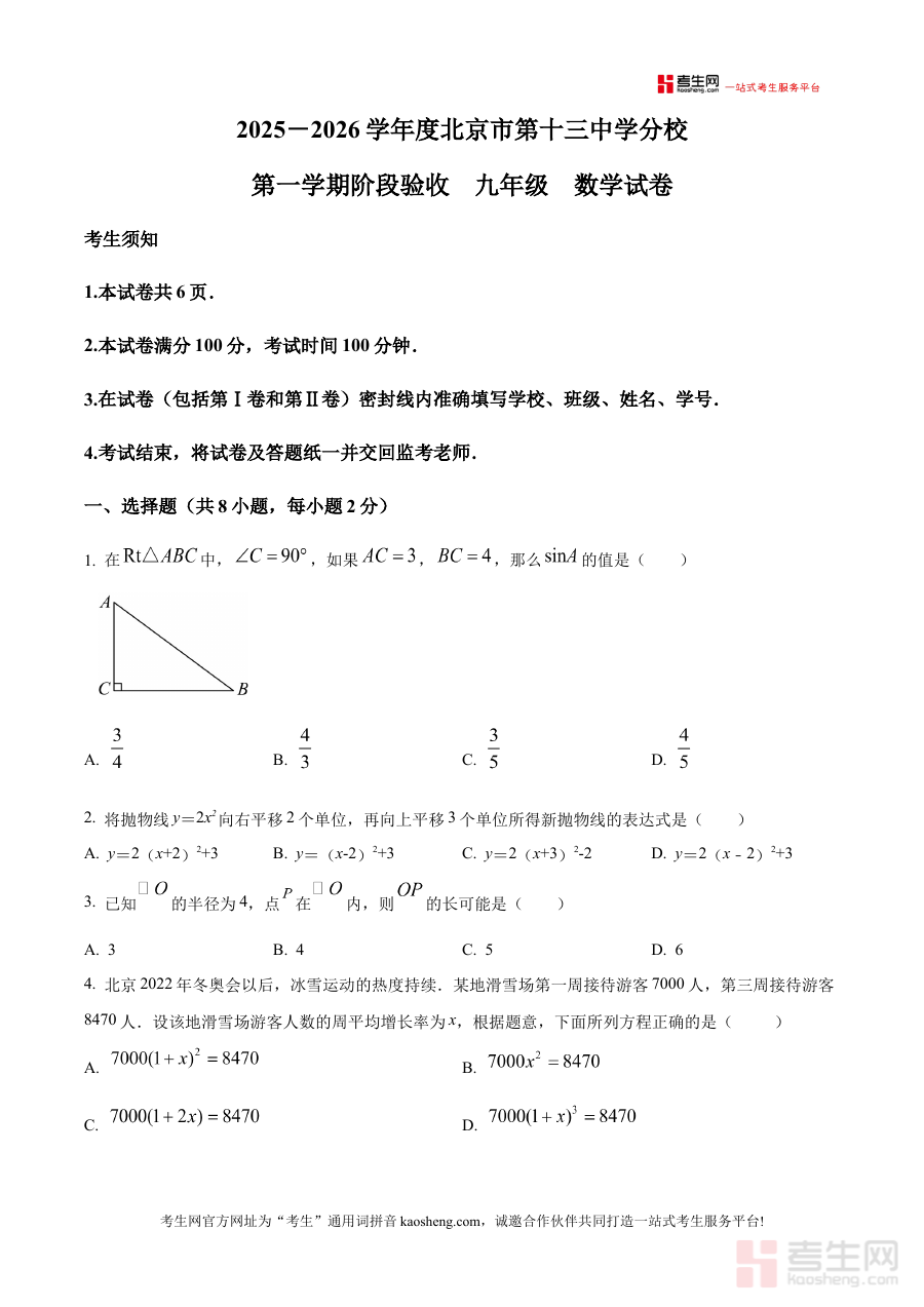 《精品解析:北京市第十三中学分校2025-2026学年九年级上学期12月月考数学试卷(原卷版)》是针对北京市第十三中学分校2025-2026学年九年级上学期12月数学月考的备考资料,结合该校该阶段教学进度与校考要求编制,为相关使用者提供贴合实际的练习与参考载体。