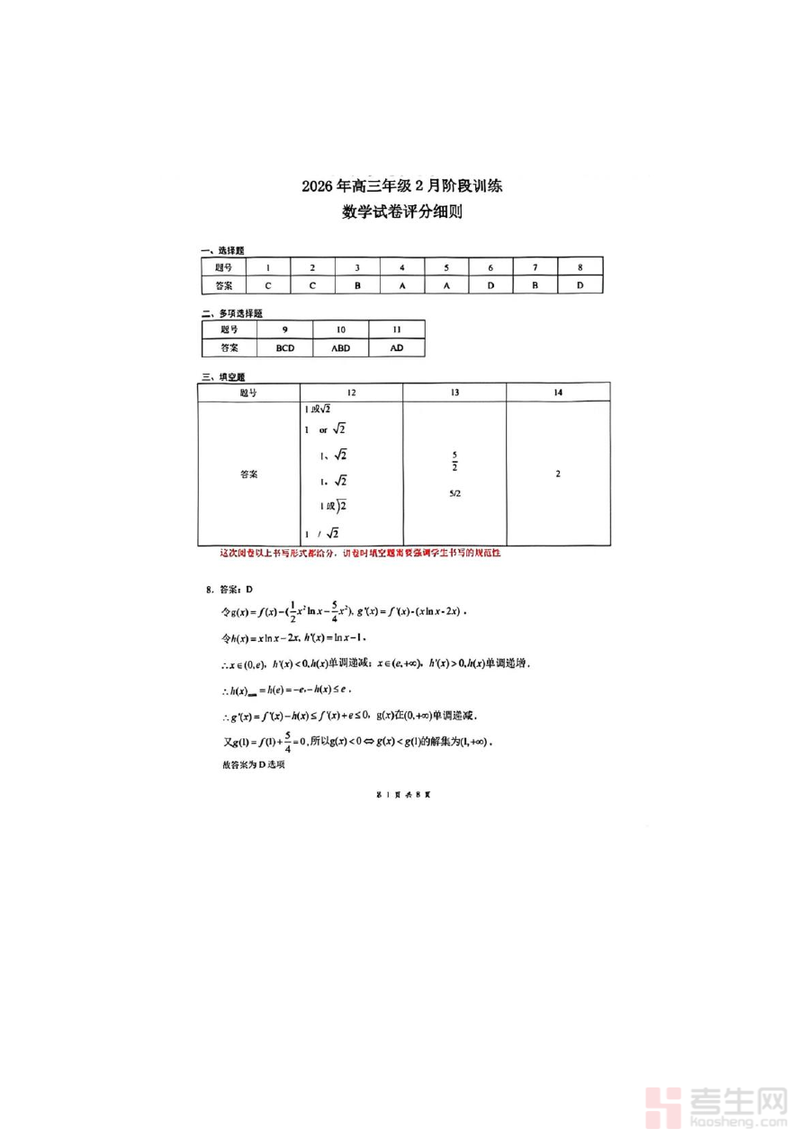 《湖北省天门中学等校2025-2026学年高三下学期2月阶段训练数学试卷 参考答案》是湖北省天门中学等校针对2025-2026学年高三下学期2月数学阶段训练配套的参考资料,属于高中数学学科阶段性备考资源,与该阶段教学进度及训练目标高度契合。