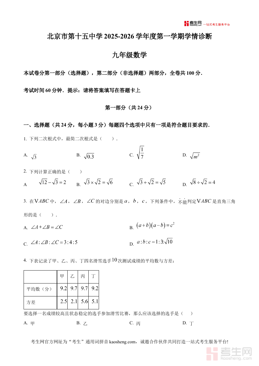 本资料适用于北京市第十五中学2025至2026学年上学期的九年级学生、数学教师及教学管理者,其原卷版特性确保了检测内容的真实性与针对性,有助于提升阶段检测的有效性,为后续数学学习与备考规划提供可靠支撑。