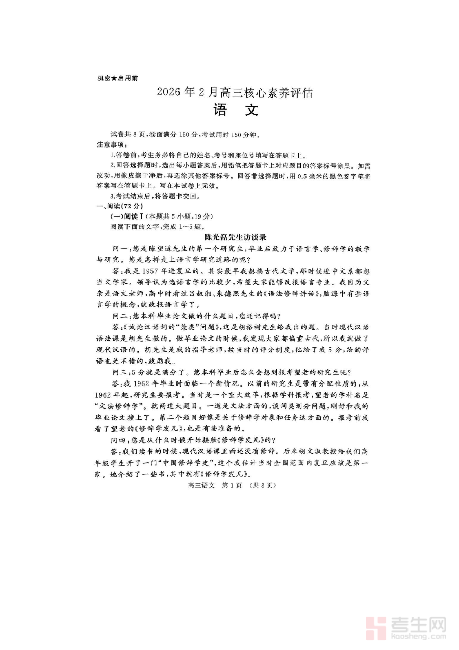 《山东名校联盟2026届高三下学期2月份核心素养评估考试语文试卷》是面向山东省2026届高三学生的阶段性评估资料,由山东名校联盟组织命题,聚焦高三下学期2月份这一关键备考节点,旨在为学生提供贴合区域教学实际的语文考试模拟内容。