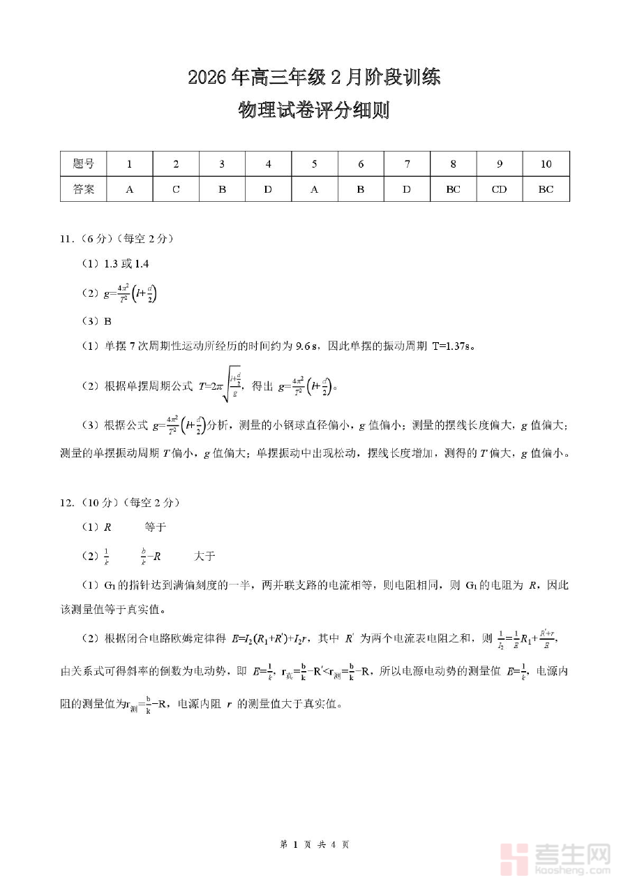本资料适用于2026届湖北云学联盟体系内的高三学生及相关物理教师。作为高三下学期关键阶段的一模检测答案,它对学生清晰认知自身物理学习水平、优化备考策略具有重要参考价值,对教师精准评估教学效果、制定针对性教学方案也有积极作用。