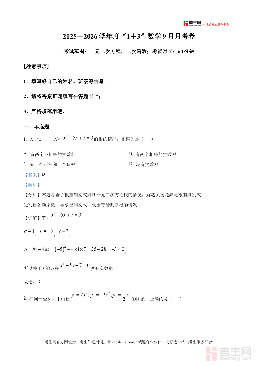 本资料适用于北京市门头沟区育新学校2025-2026学年九年级学生进行月考后的复盘总结,也可供该校数学教师用于教学指导与试卷讲评,其解析内容能有效辅助学生提升阶段复习效率,强化对数学知识的理解与应用能力。