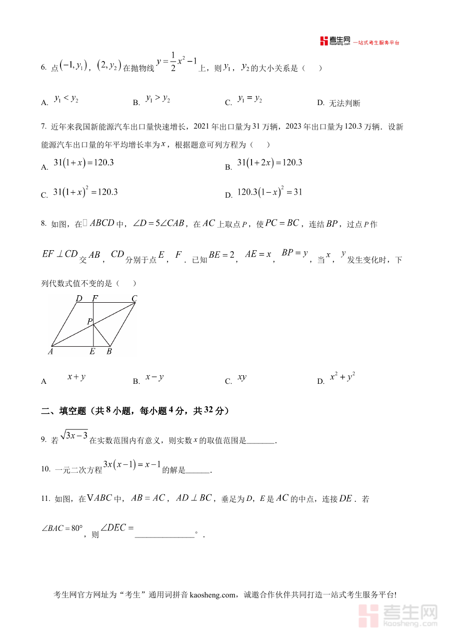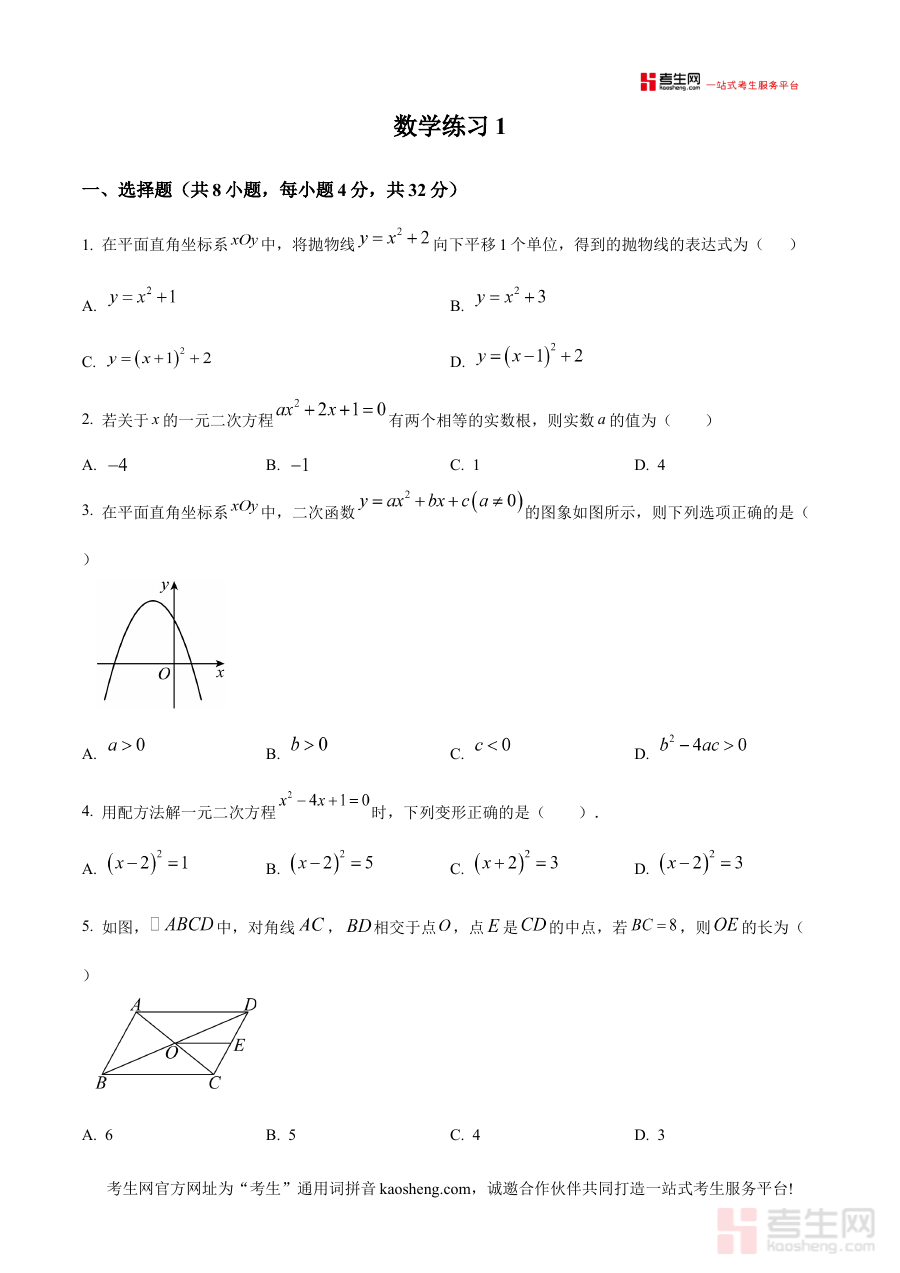 该资料可帮助学生在开学初期快速了解自身数学知识掌握情况,为后续九年级数学学习的备考规划提供参考依据,同时也能作为教师开展学情分析与教学调整的辅助工具,助力师生明确开学阶段的学习重点与方向。