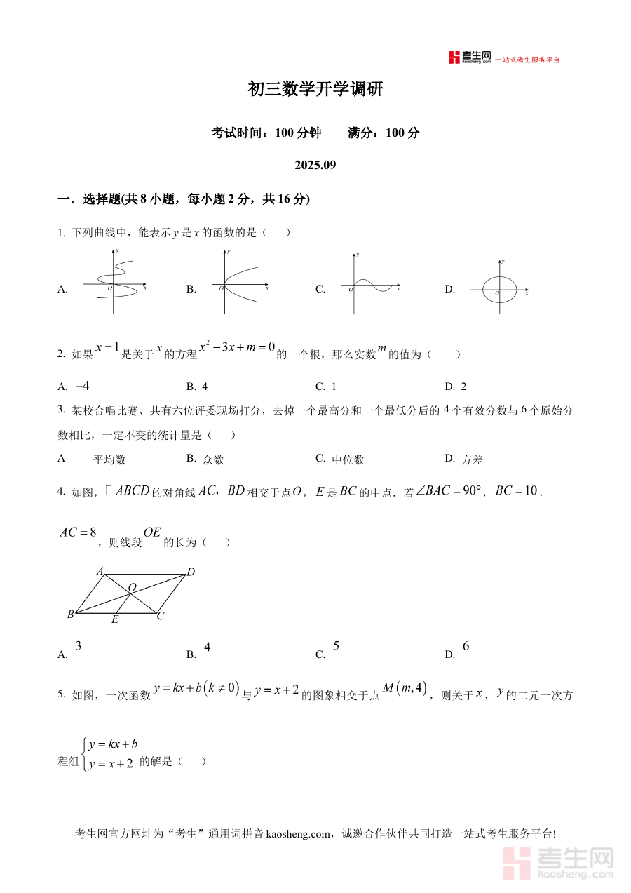 《精品解析:北京德胜中学2025-2026学年上学期九年级数学开学调研试卷(原卷版)》是北京德胜中学针对本校九年级学生在2025至2026学年上学期开学初期设计的数学学科调研资料,属于学校内部阶段性检测试卷的原卷版本,能够直接反映该校九年级数学开学阶段的检测方向与要求,为学生和教师提供了解该阶段数学学习情况的可靠参考依据,是九年级数学开学初期开展备考准备与学情掌握工作的重要资源。