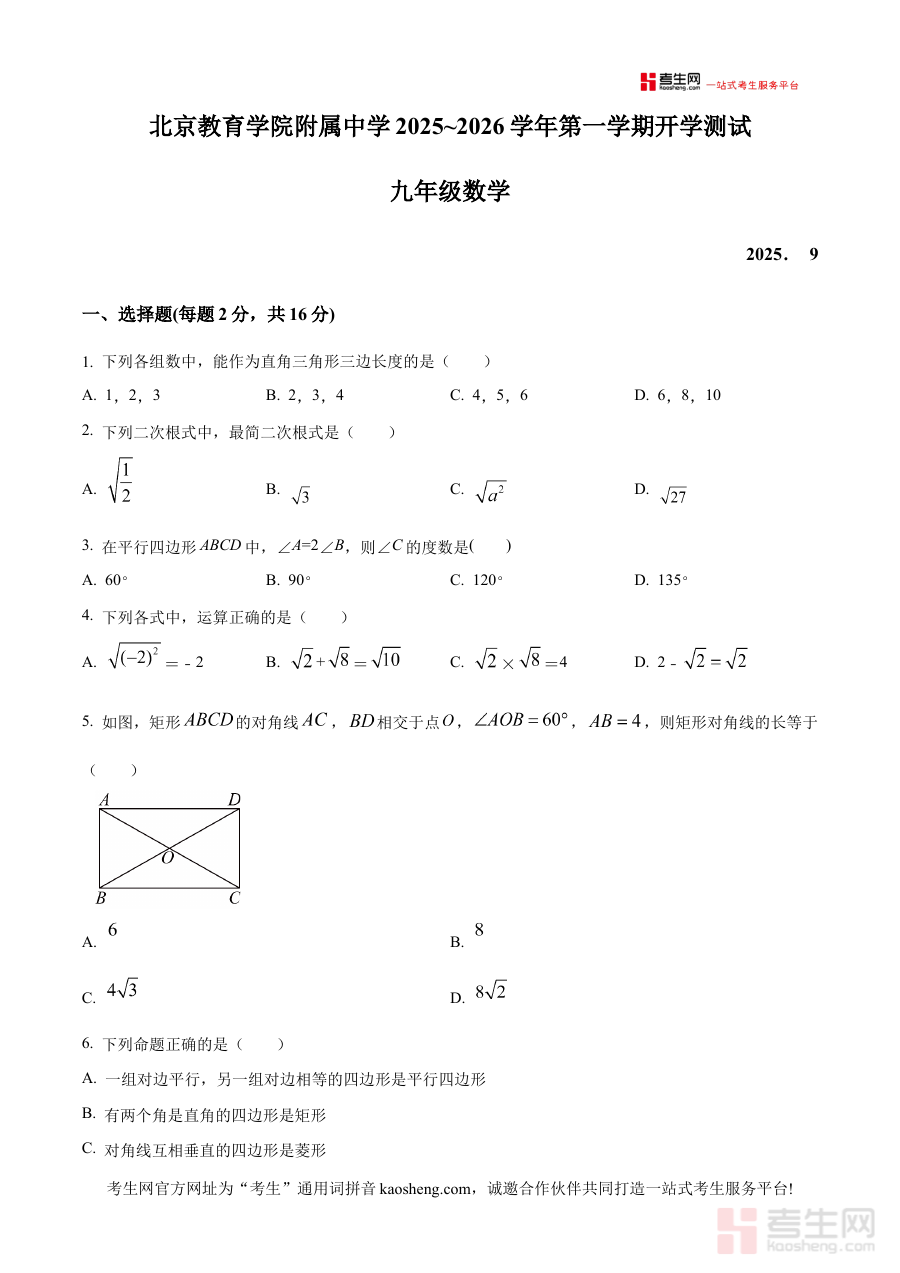 本资料主要适用于北京教育学院附属中学2025~2026学年的九年级学生,帮助他们在开学前或开学初期进行自我检测与备考准备,提前适应开学后的学习节奏;同时也适用于该校数学教师,作为开学阶段教学评估与学情分析的重要工具;对于关注北京地区初中开学考趋势或同类学校考试模式的其他师生而言,该资料也具有一定的参考价值,能够助力他们更好地开展阶段检测与备考规划工作。
