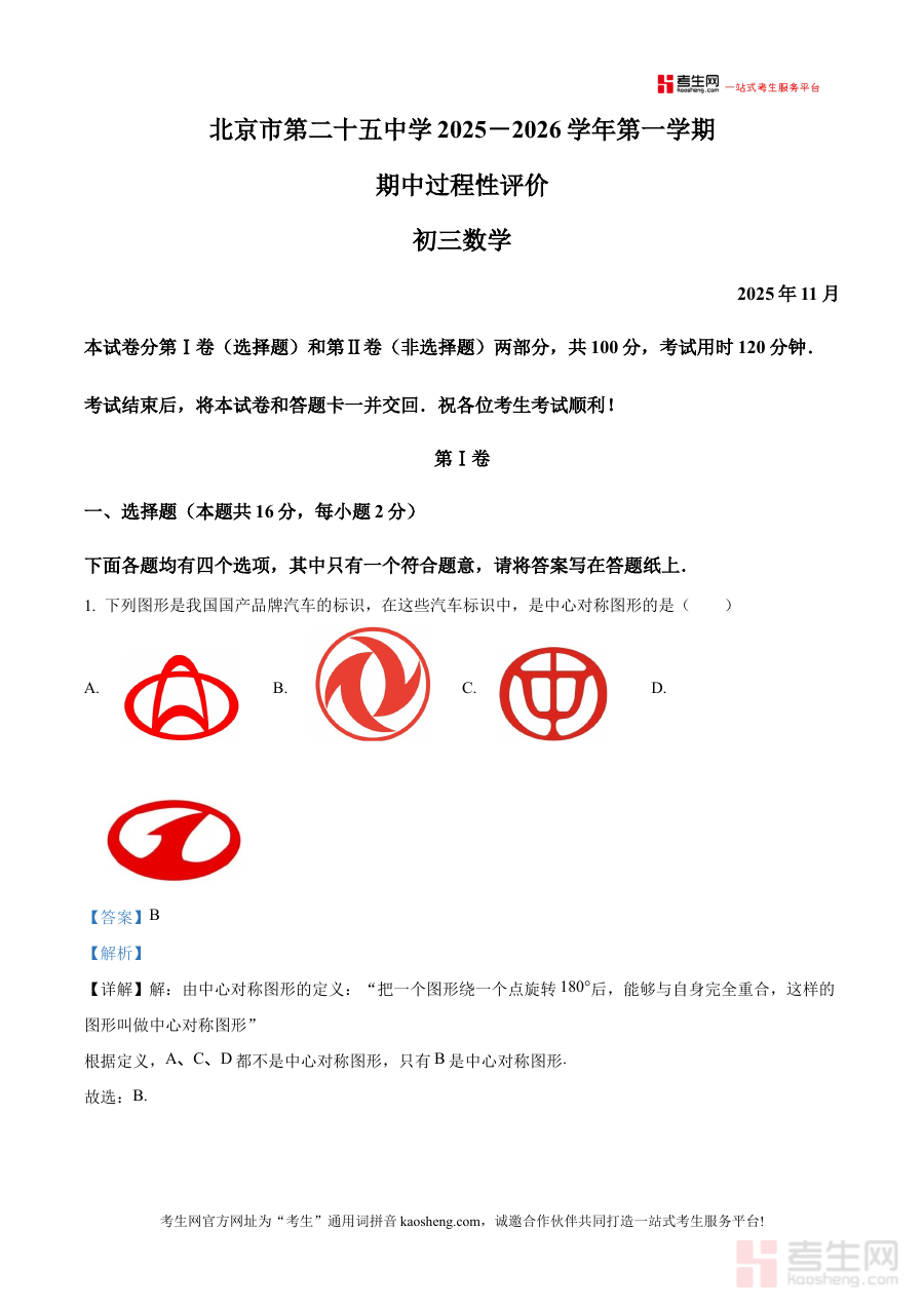 《精品解析:北京市第二十五中学2025-2026学年九年级上学期期中数学试卷(解析版)》是针对北京市第二十五中学特定学年及学段的数学学科期中考试所编制的解析类备考资料,涵盖了该学校九年级上学期期中数学考试的相关内容,为使用者提供了与该校期中数学考试直接相关的参考资源,是符合该阶段数学学习进度与考试要求的针对性资料。