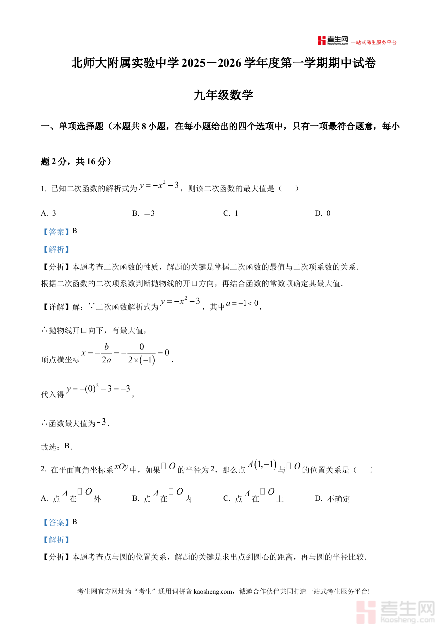 《精品解析:北京市北京师范大学附属实验中学2025-2026学年九年级上学期期中数学试卷(解析版)》是针对北京市北京师范大学附属实验中学2025-2026学年九年级上学期期中数学考试的精品解析类备考资料,能够为相关师生提供该阶段数学考试的针对性参考,帮助使用者提前熟悉期中数学考试的考查方向与基本要求,为后续的系统复习与准备工作奠定坚实基础,是该阶段数学学习过程中重要的辅助材料之一。