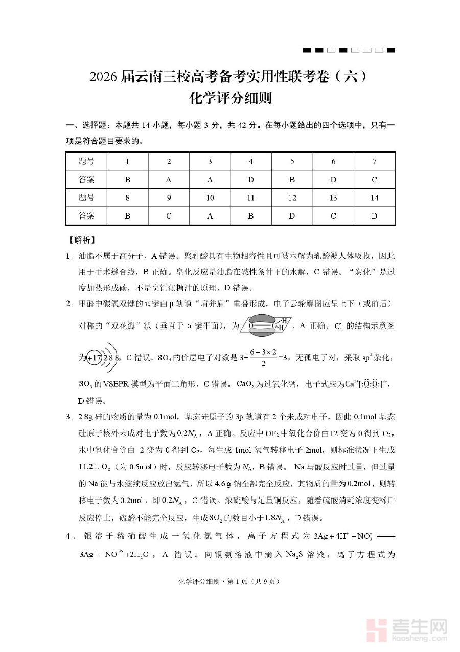 《2026届云南三校高考备考实用性联考卷(六)化学-答案》是针对2026届云南地区三所学校联合组织的高考化学备考实用性联考第六套试卷的配套答案资料,属于高考备考阶段的重要辅助资源,旨在为参与该联考的师生提供标准化的答题参考依据。