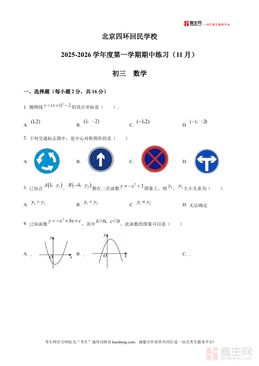 《精品解析:北京市回民学校2025-2026学年九年级上学期期中数学试卷(原卷版)》是针对北京市回民学校2025-2026学年九年级上学期期中数学考试设计的备考资料,呈现了该次期中数学考试的原卷形式内容。作为贴合该校九年级上学期数学教学进度与考查要求的素材,它能帮助使用者快速熟悉该次期中数学考试的基本结构与呈现方式,为后续的备考准备提供基础参考,让使用者更贴近实际考试场景。
