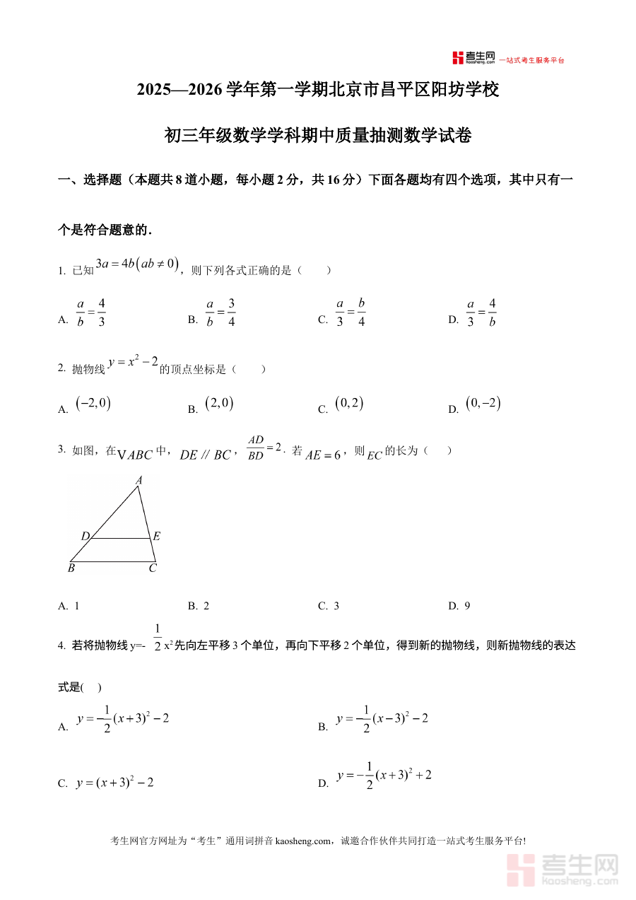 《精品解析:北京市昌平区阳坊学校 2025-2026学年上学期九年级数学学科期中质量抽测数学试卷(原卷版)》是针对北京市昌平区阳坊学校2025-2026学年上学期九年级数学期中质量抽测设计的备考资料,精准对应该阶段数学学科的期中检测场景,提供与实际考试一致的原卷内容。