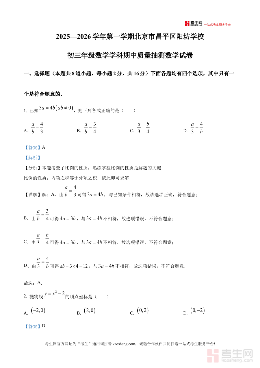 《精品解析:北京市昌平区阳坊学校 2025-2026学年上学期九年级数学学科期中质量抽测数学试卷(解析版)》是针对北京市昌平区阳坊学校2025至2026学年上学期九年级数学期中质量抽测的专业备考资料,聚焦该阶段数学学科的期中检测场景,依托具体学校的期中抽测背景,为相关使用者提供具有明确针对性的解析内容,助力使用者更好地应对此次期中质量抽测。