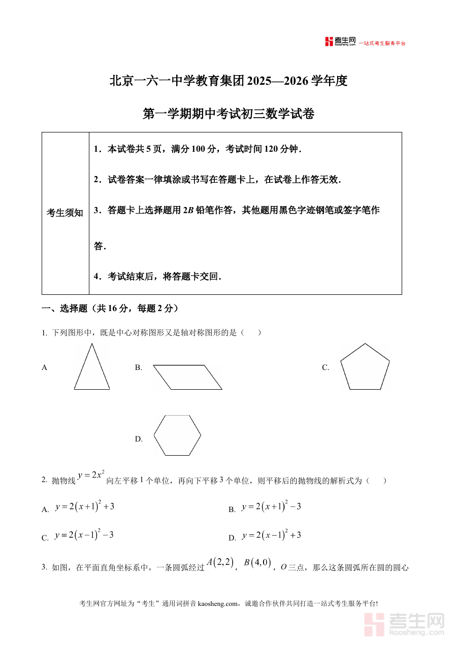《精品解析:北京一六一中学教育集团2025—2026学年上学期期中考试 九年级数学试卷 (原卷版)》是北京一六一中学教育集团在2025—2026学年上学期面向九年级学生组织的数学期中考试对应的原卷版备考资料。该资料严格匹配该教育集团的阶段性考试安排,能够为学生提供与实际考试完全一致的试卷形式,帮助学生提前熟悉考试的整体框架和考查方向,是贴合该阶段数学学习需求的重要参考材料。
