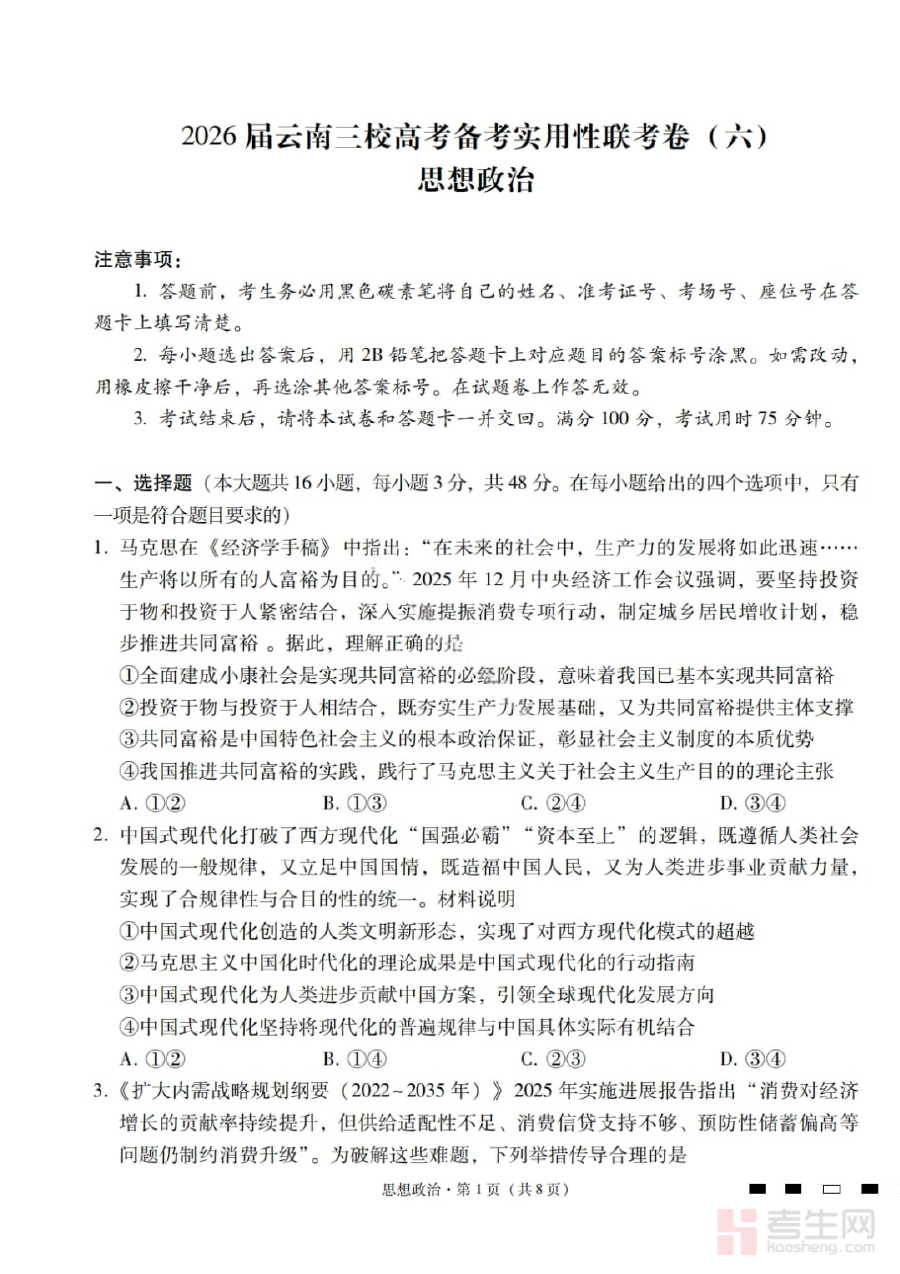 《2026届云南三校高考备考实用性联考卷(六)政治》是针对2026届云南省内三所学校联合组织的高考政治备考系列资料中的第六套试卷,属于高三学生高考复习阶段的重要练习资源,结合了三校在政治学科教学中的优势与对高考命题规律的研究成果,能够为考生提供符合本地高考方向的阶段性训练内容。