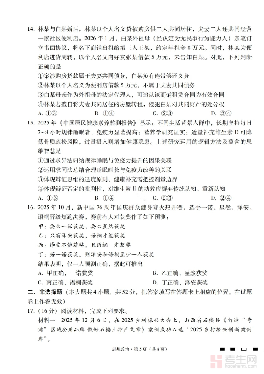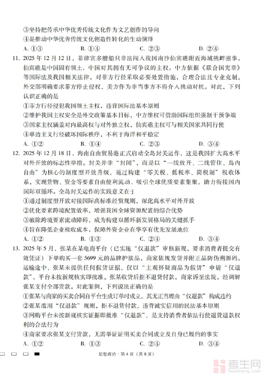 本试卷适用于2026届云南三校联盟内的高三政治考生以及希望参考云南地区高考政治备考节奏的同类学生群体;通过完成该试卷,考生不仅能模拟高考政治考试的答题环境与时间管理要求,还能强化对政治学科核心知识点的理解与应用能力,提升应试技巧,为高考前的冲刺阶段做好充分准备。