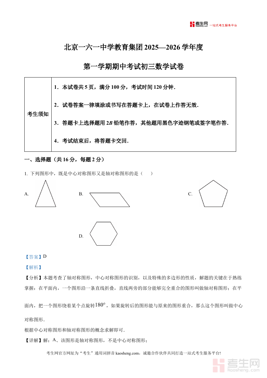 《精品解析:北京一六一中学教育集团2025—2026学年上学期期中考试 九年级数学试卷 (解析版)》是针对北京一六一中学教育集团在2025至2026学年上学期开展的九年级数学期中考试所编制的解析类备考资料。该资料依托该教育集团的期中检测场景,聚焦九年级上学期数学学科的阶段性考查需求,紧密贴合该集团内部的教学进度与知识覆盖范围,为使用者提供与本次考试直接相关的专业解析内容,是对接该集团教学标准与考查方向的重要参考资料。