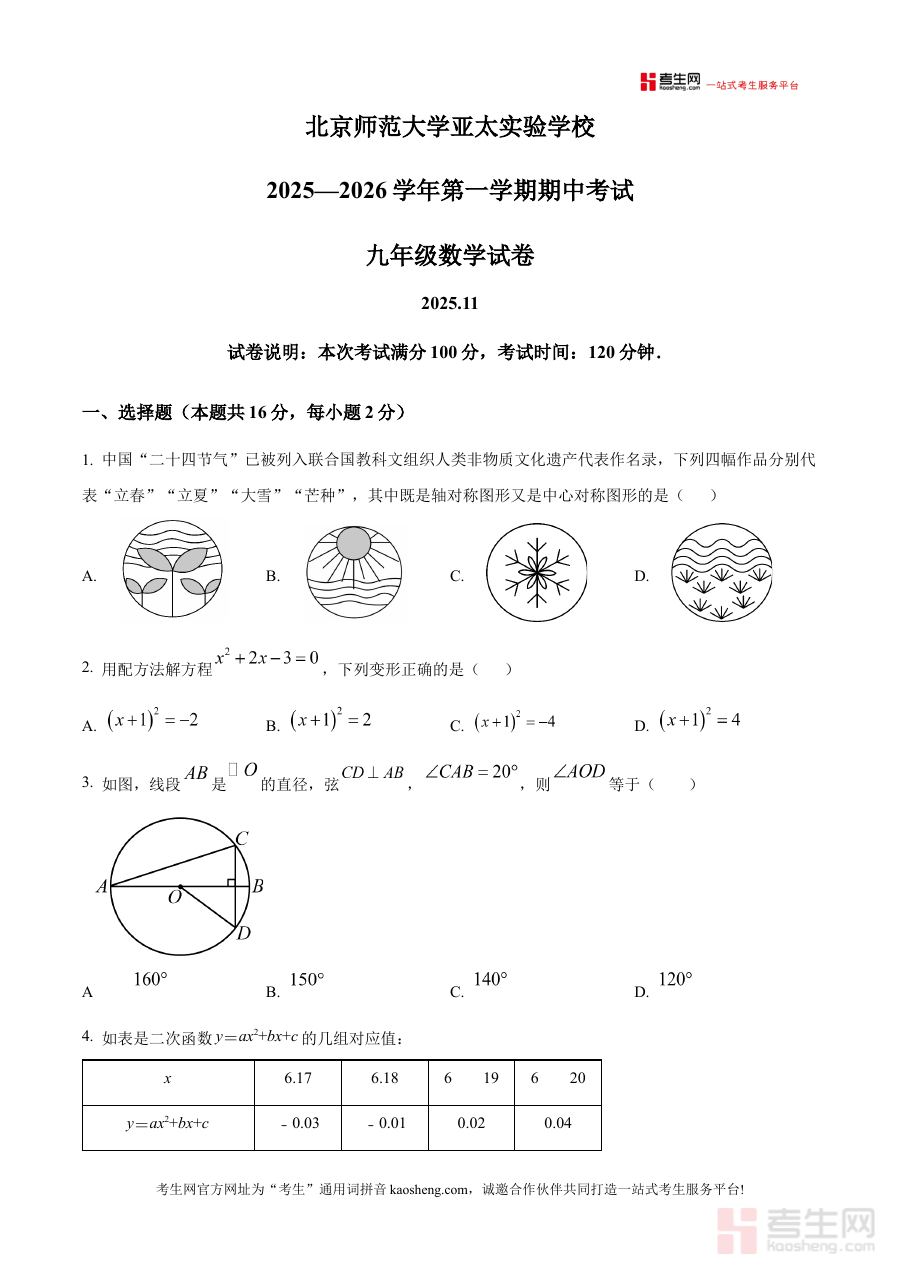 《精品解析:北京市北京师范大学亚太实验学校2025--2026学年九年级上学期期中数学试卷(原卷版)》是一份针对特定学校特定阶段数学考试的专用备考资料,它来源于北京市北京师范大学亚太实验学校,对应2025至2026学年九年级上学期的期中数学考试,以原卷版形式呈现,保留了该校该次考试试卷的原始样貌,为使用者提供与实际考试完全一致的试卷资源,明确了资料的地域属性、学校背景、时间范围及考试阶段和科目属性。