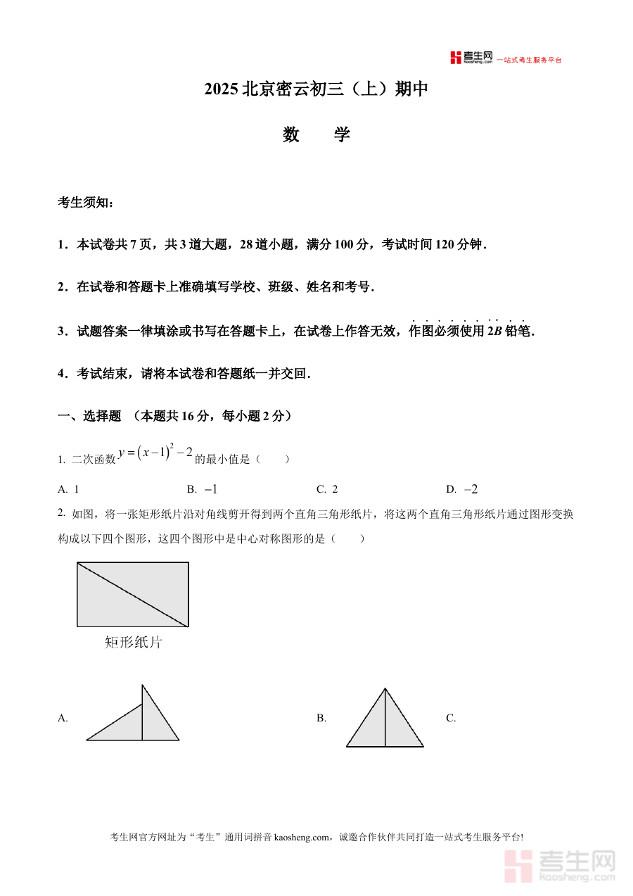 《精品解析:北京市密云区2025--2026学年九年级上学期期中数学试卷(原卷版)》是针对北京市密云区2025至2026学年九年级上学期期中数学考试设计的备考资料,精准匹配该地区该学年九年级上学期的期中检测要求,为学生提供贴合本地教学进度与考试标准的练习载体。